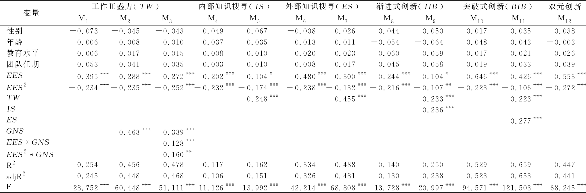 同上,建立工作旺盛力的回归模型TW=β0+β1EES+β2EES2,回归结果如表3的M1所示。可以发现,β1=0.395,β2= -0.234(p<0.001),曲线斜率K=-0.468EES+0.395,当EES=-3.22时,曲线斜率K1=1.902,K>0;当EES=2.38时,曲线斜率K2=-0.719,K<0;曲线拐点-β1/2β2=0.844,在[-3.22,2.38]区间内,结果满足倒U型的3个条件,故验证了假设H2,二者关系如图3所示。此外,M5显示,工作旺盛力对内部知识搜寻有显著正向影响(β=0.248,p<0.001),故验证了假设H3a;M7显示,工作旺盛力对外部知识搜寻有显著正向作用(β=0.455,p<0.001),验证了假设H3b;M9显示,内部知识搜寻对渐进式创新有正向影响(β=0.236,p<0.001),验证了假设H4b;M11显示,外部知识搜寻对突破式创新有正向影响(β=0.277,p<0.001),支持了假设H4a。