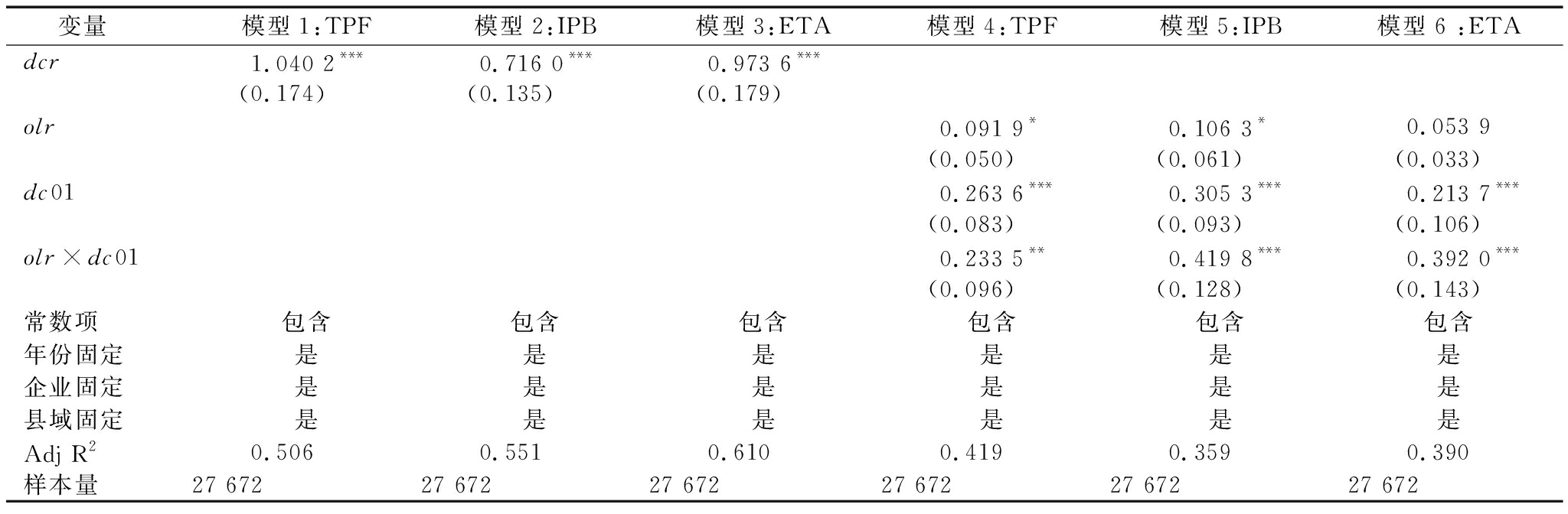 变量模型1:TPF模型2:IPB模型3:ETA模型4:TPF模型5:IPB模型6 :ETAdcr1.040 2***0.716 0***0.973 6***(0.174)(0.135)(0.179)olr0.091 9*0.106 3*0.053 9(0.050)(0.061)(0.033)dc010.263 6***0.305 3***0.213 7***(0.083)(0.093)(0.106)olr×dc010.233 5**0.419 8***0.392 0***(0.096)(0.128)(0.143)常数项包含包含包含包含包含包含年份固定是是是是是是企业固定是是是是是是县域固定是是是是是是Adj R20.5060.5510.6100.4190.3590.390样本量27 67227 67227 67227 67227 67227 672