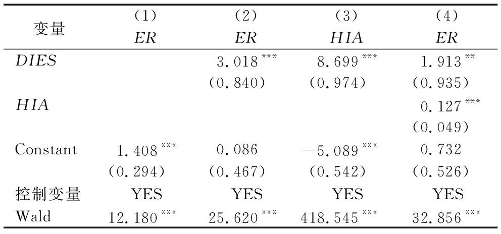 变量(1)(2)ERERDIES2.944***(0.855)Constant1.344***0.092(0.299)(0.467)控制变量YESYESWald13.492**27.896***