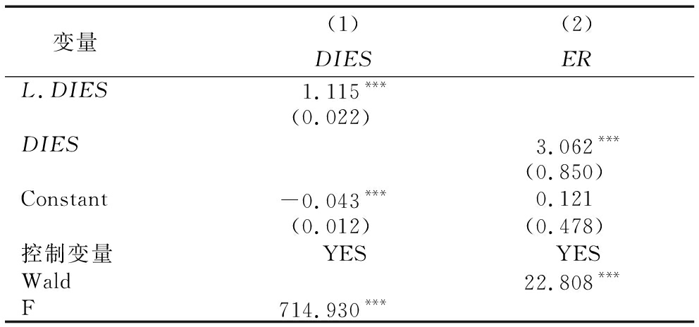 变量(1)(2)DIESERL.DIES1.115***(0.022)DIES3.062***(0.850)Constant-0.043***0.121(0.012)(0.478)控制变量YESYESWald22.808***F714.930***