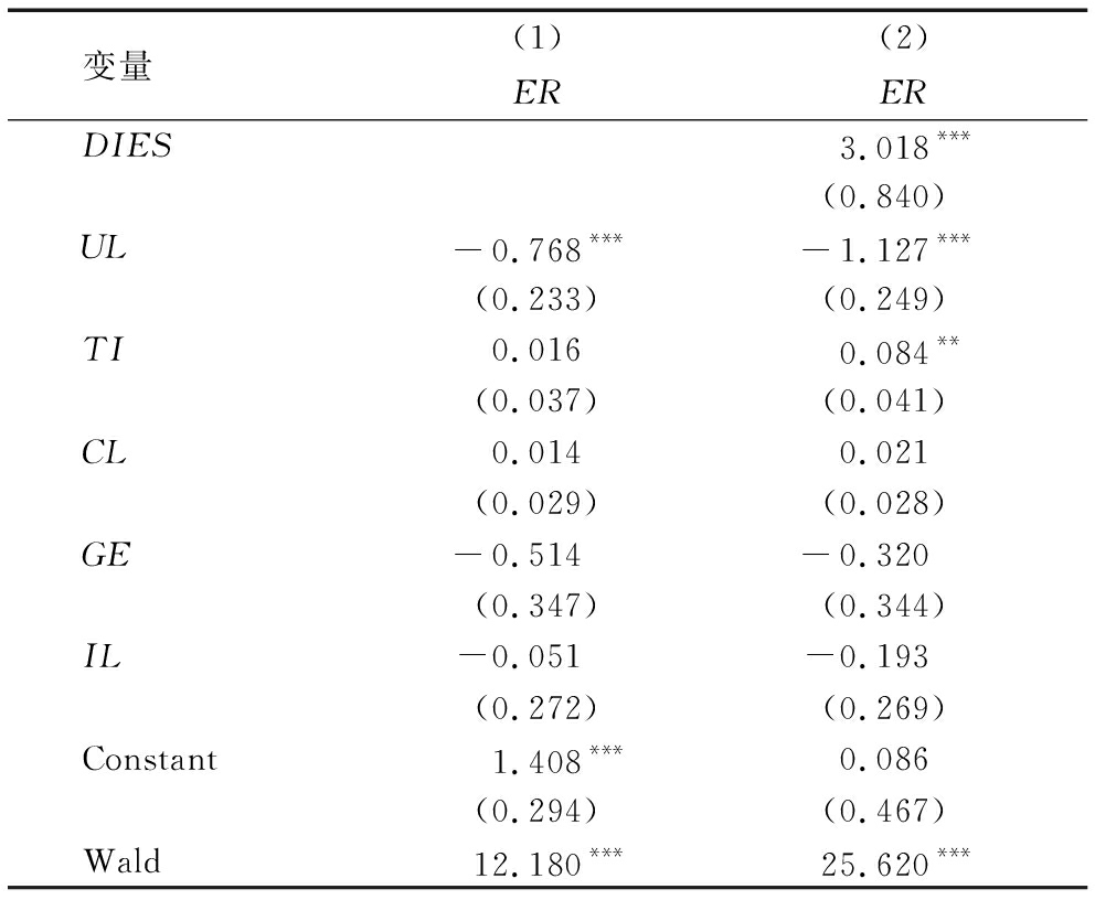 变量(1)(2)ERERDIES3.018***(0.840)UL-0.768***-1.127***(0.233)(0.249)TI0.0160.084**(0.037)(0.041)CL0.0140.021(0.029)(0.028)GE-0.514-0.320(0.347)(0.344)IL-0.051-0.193(0.272)(0.269)Constant1.408***0.086(0.294)(0.467)Wald12.180***25.620***