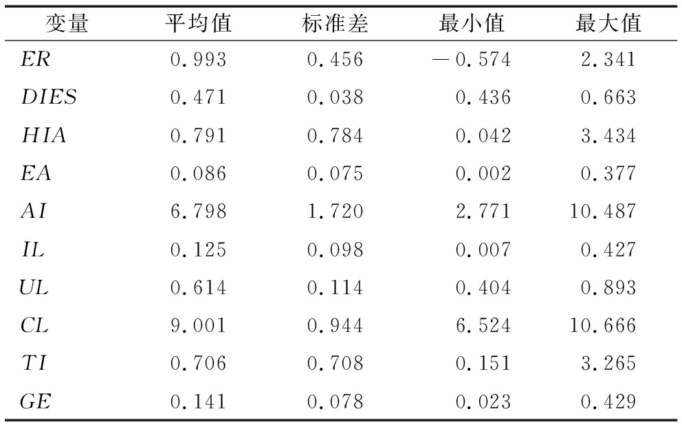 变量平均值标准差最小值最大值ER0.9930.456-0.5742.341DIES0.4710.0380.4360.663HIA0.7910.7840.0423.434EA0.0860.0750.0020.377AI6.7981.7202.77110.487IL0.1250.0980.0070.427UL0.6140.1140.4040.893CL9.0010.9446.52410.666TI0.7060.7080.1513.265GE0.1410.0780.0230.429