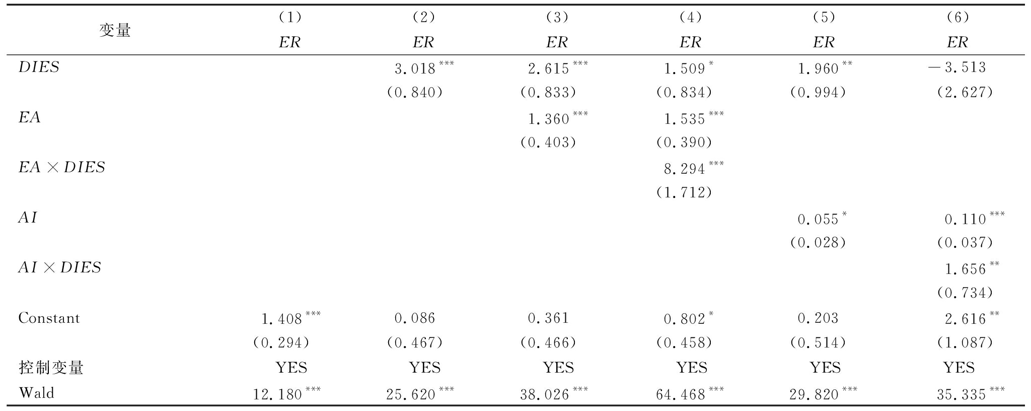 变量(1)(2)(3)(4)(5)(6)ERERERERERERDIES3.018***2.615***1.509*1.960**-3.513(0.840)(0.833)(0.834)(0.994)(2.627)EA1.360***1.535***(0.403)(0.390)EA×DIES8.294***(1.712)AI0.055*0.110***(0.028)(0.037)AI×DIES1.656**(0.734)Constant1.408***0.0860.3610.802*0.2032.616**(0.294)(0.467)(0.466)(0.458)(0.514)(1.087)控制变量YESYESYESYESYESYESWald12.180***25.620***38.026***64.468***29.820***35.335***