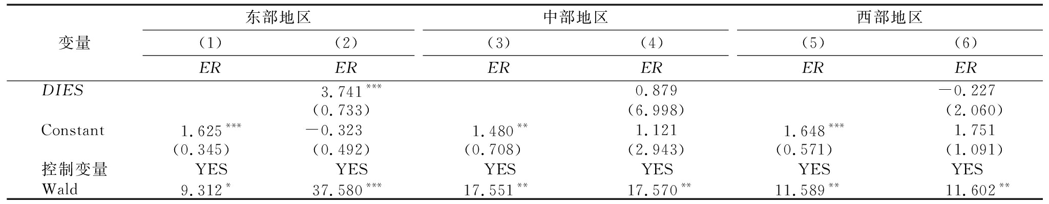 变量东部地区(1)(2)ERER中部地区(3)(4)ERER西部地区(5)(6)ERERDIES3.741***0.879-0.227(0.733)(6.998)(2.060)Constant1.625***-0.3231.480**1.1211.648***1.751(0.345)(0.492)(0.708)(2.943)(0.571)(1.091)控制变量YESYESYESYESYESYESWald9.312*37.580***17.551**17.570**11.589**11.602**
