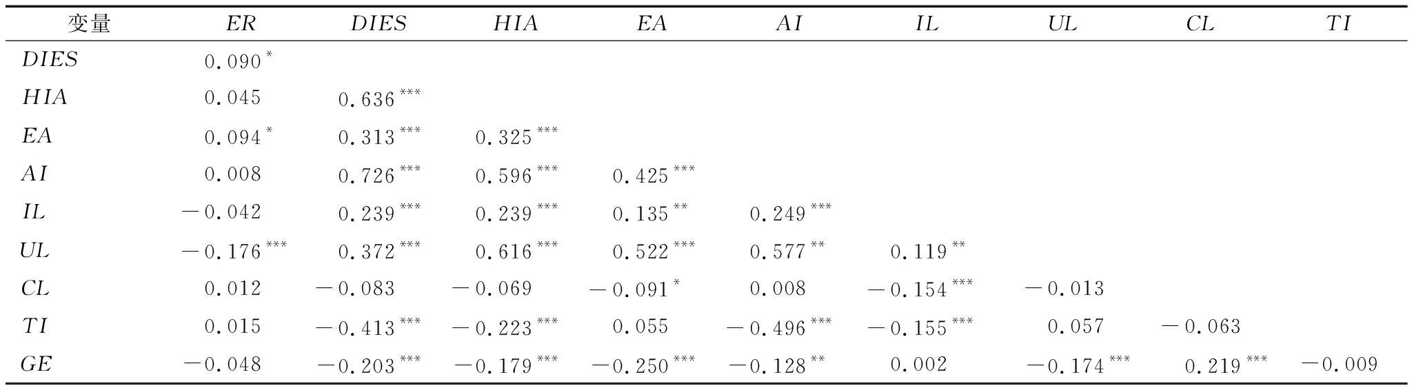 变量ERDIESHIAEAAIILULCLTIDIES0.090*HIA0.0450.636***EA0.094*0.313***0.325***AI0.0080.726***0.596***0.425***IL-0.0420.239***0.239***0.135**0.249***UL-0.176***0.372***0.616***0.522***0.577**0.119**CL0.012-0.083-0.069-0.091*0.008-0.154***-0.013TI0.015-0.413***-0.223***0.055-0.496***-0.155***0.057-0.063GE-0.048-0.203***-0.179***-0.250***-0.128**0.002-0.174***0.219***-0.009