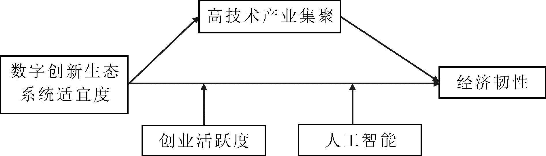 通过梳理相关文献可知,现有研究探讨了数字技术和创新方面的相关因素对经济韧性的影响。如Zou[4]研究发现,数字技术通过维持协作网络促进杭州经济恢复韧性;闫绪娴和郭伟[5]分析了数字基础设施对省域经济韧性的影响;Martin[6]探究了创新能力与城市经济韧性的关系;张辽和姚蕾[7]采用空间杜宾模型探究了数字技术创新对城市经济韧性的影响。但是,鲜有研究探讨数字创新生态系统适宜度与省域经济韧性的关系。因此,本文尝试引入生态位适宜度理念,深入剖析数字创新生态系统适宜度对省域经济韧性的影响。此外,高适宜度的数字创新生态系统可以打破技术壁垒、促进知识与技术共享,推动高技术产业集聚,而高技术产业集聚通过加强省域产业链与创新链融合,促进省域技术进步,进一步增强省域经济韧性。那么,高技术产业集聚是否在数字创新生态系统适宜度影响省域经济韧性中产生路径作用?不仅如此,创业是推动经济高质量发展的核心动力[8],和谐的创业环境是经济发展的基础条件。创业活跃度越高,越有利于省域数字创新生态系统适宜度发挥优势,促进科技成果转化,提高省域经济韧性。因此,创业活跃度是否调节数字创新生态系统适宜度与省域经济韧性的关系也是值得探究的一个重要问题。省域经济发展离不开良好的数字环境,人工智能发展能引发数据资源汇聚,优化智能决策过程,进而增强数字创新生态系统适宜度对省域经济韧性的影响。因此,有必要探讨人工智能在数字创新生态系统适宜度影响省域经济韧性中的调节效应。