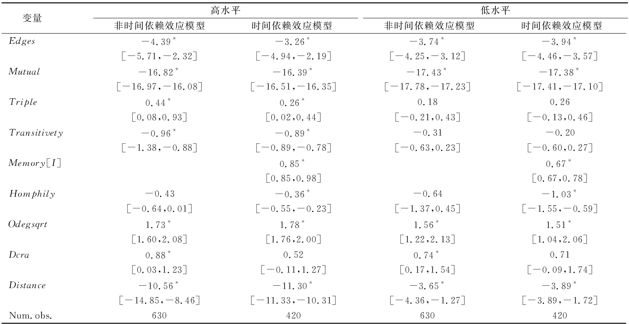 变量高水平非时间依赖效应模型时间依赖效应模型低水平非时间依赖效应模型时间依赖效应模型Edges-4.39*-3.26*-3.74*-3.94*[-5.71,-2.32][-4.94,-2.19][-4.25,-3.12][-4.46,-3.57]Mutual-16.82*-16.39*-17.43*-17.38*[-16.97,-16.08][-16.51,-16.35][-17.78,-17.23][-17.41,-17.10]Triple0.44*0.26*0.180.26[0.08,0.93][0.02,0.44][-0.21,0.43][-0.13,0.46]Transitivety-0.96*-0.89*-0.31-0.20[-1.38,-0.88][-0.89,-0.78][-0.63,0.23][-0.60,0.27]Memory[I]0.85*0.67*[0.85,0.98][0.67,0.78]Homphily-0.43-0.36*-0.64-1.03*[-0.64,0.01][-0.55,-0.23][-1.37,0.45][-1.55,-0.59]Odegsqrt1.73*1.78*1.56*1.51*[1.60,2.08][1.76,2.00][1.22,2.13][1.04,2.06]Dcra0.88*0.520.74*0.71[0.03,1.23][-0.11,1.27][0.17,1.54][-0.09,1.74]Distance-10.56*-11.30*-3.65*-3.89*[-14.85,-8.46][-11.33,-10.31][-4.36,-1.27][-3.89,-1.72]Num.obs.630420630420