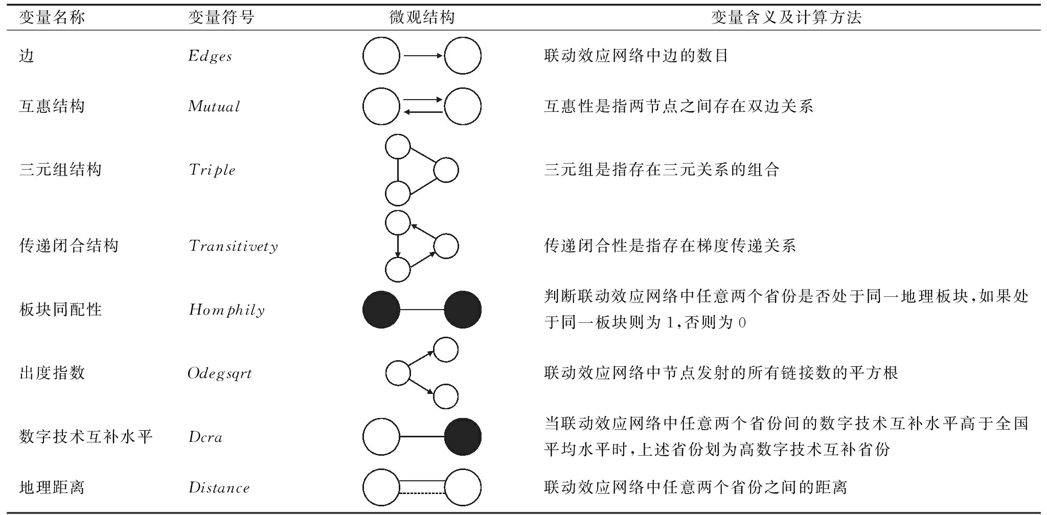 变量名称变量符号微观结构变量含义及计算方法边Edges联动效应网络中边的数目互惠结构Mutual互惠性是指两节点之间存在双边关系三元组结构Triple三元组是指存在三元关系的组合传递闭合结构Transitivety传递闭合性是指存在梯度传递关系板块同配性Homphily判断联动效应网络中任意两个省份是否处于同一地理板块,如果处于同一板块则为1,否则为0出度指数Odegsqrt联动效应网络中节点发射的所有链接数的平方根数字技术互补水平Dcra当联动效应网络中任意两个省份间的数字技术互补水平高于全国平均水平时,上述省份划为高数字技术互补省份地理距离Distance联动效应网络中任意两个省份之间的距离