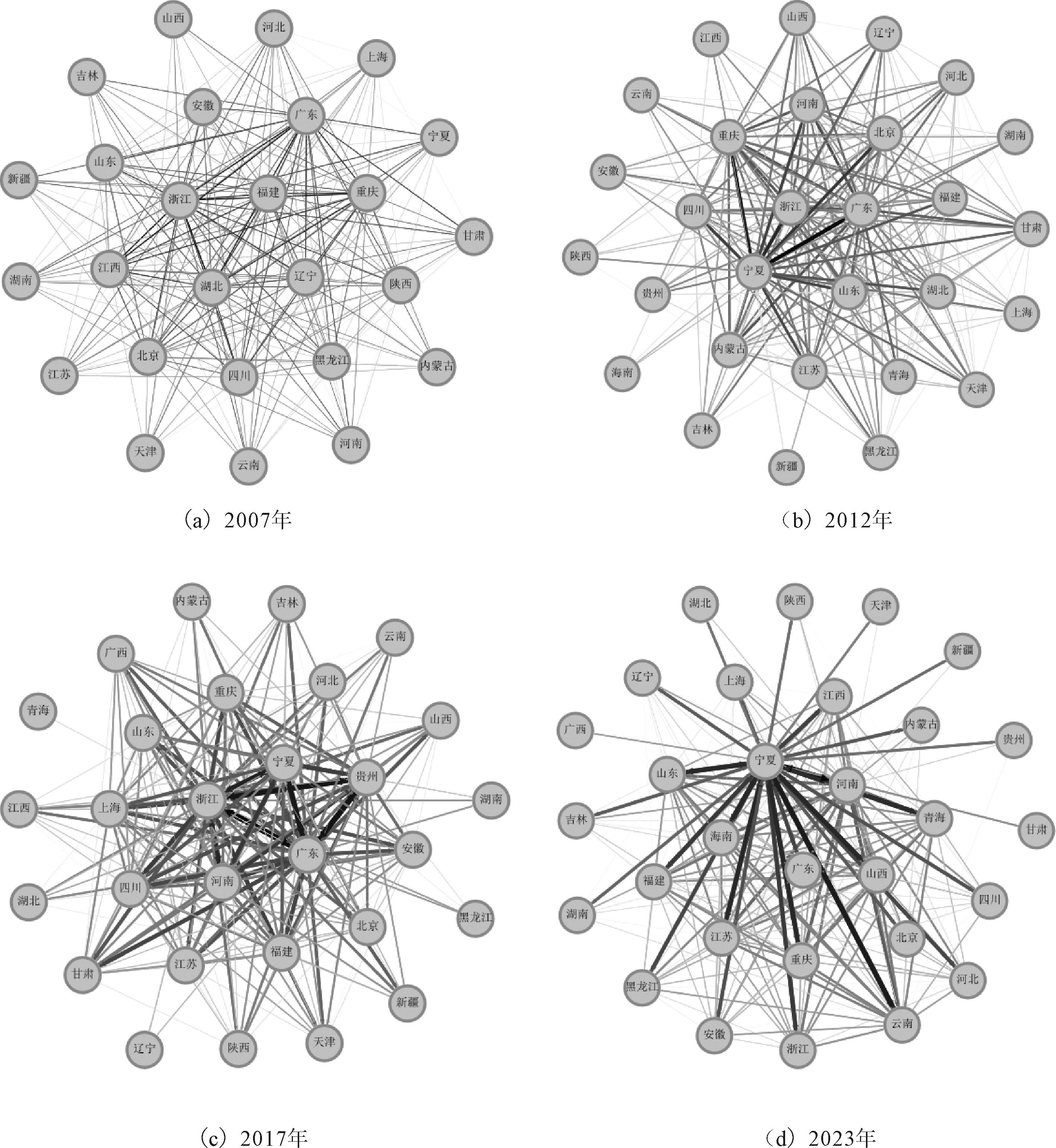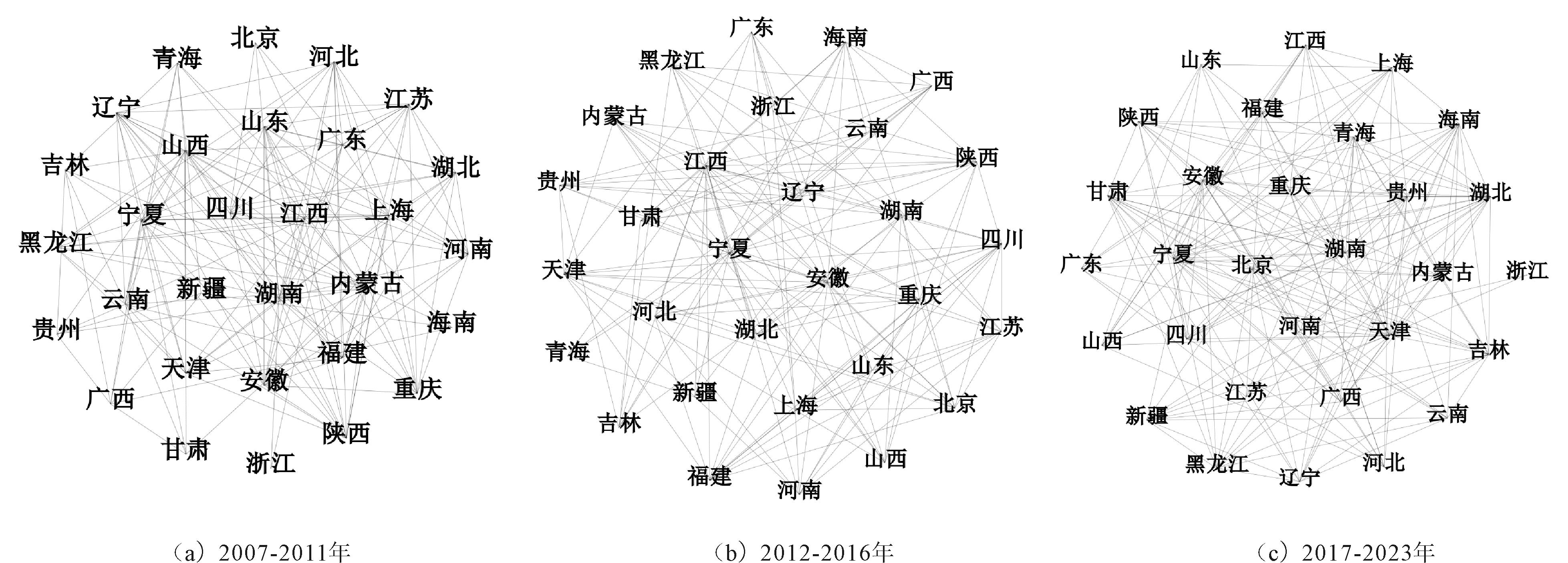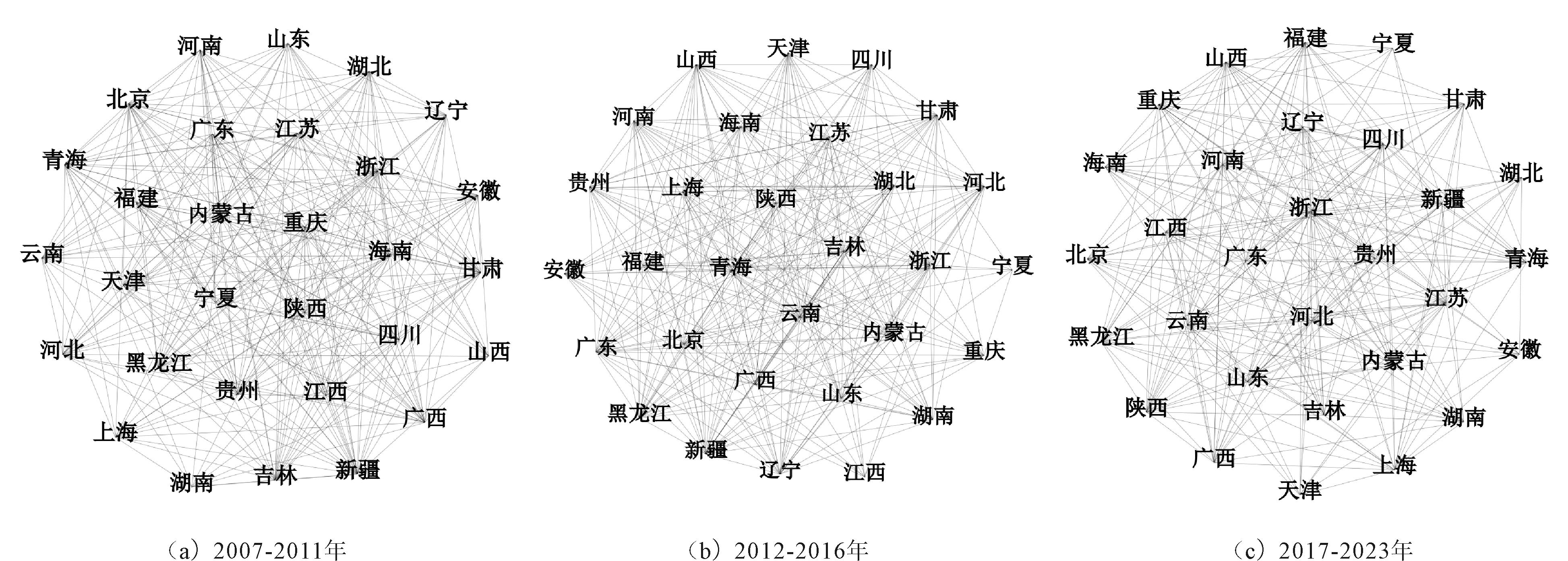 2007-2023年我国省域间数字技术互补关系呈现显著变化。2007年网络连边的粗细度相似,说明此时数字技术互补水平在不同省域间差异较小;2012年部分连边呈现变粗态势,表明部分地区数字技术互补能力提升,部分省域之间开始构建起相对紧密的合作关系;至2017年,连边粗细差异更加明显,数字技术互补网络愈发紧密,一些省域成为数字技术互补的关键节点,与众多其他省域形成强互补关系;到2023年,网络节点差异进一步扩大,核心省域在网络中的地位更加凸显。
