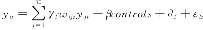 其中,yit表示第i个省份在t年的数字技术互补水平,本文采用该省份与其它省份数字技术互补程度的均值衡量。γiwijt表示其它省份数字技术互补水平变化对第i个省份数字技术互补水平的影响,即由第j个省份指向第i个省份的联动效应。Wijt为空间权重矩阵,本文采用动态引力矩阵形式。