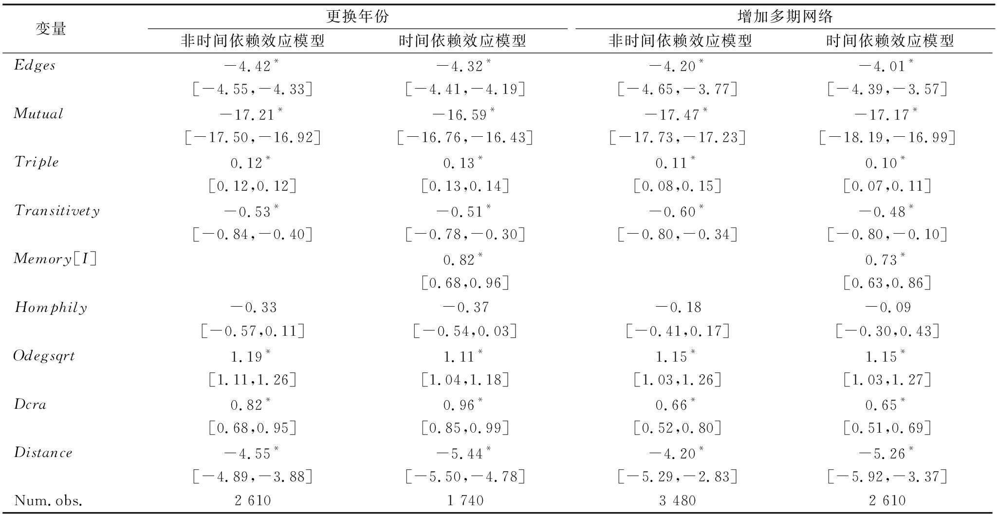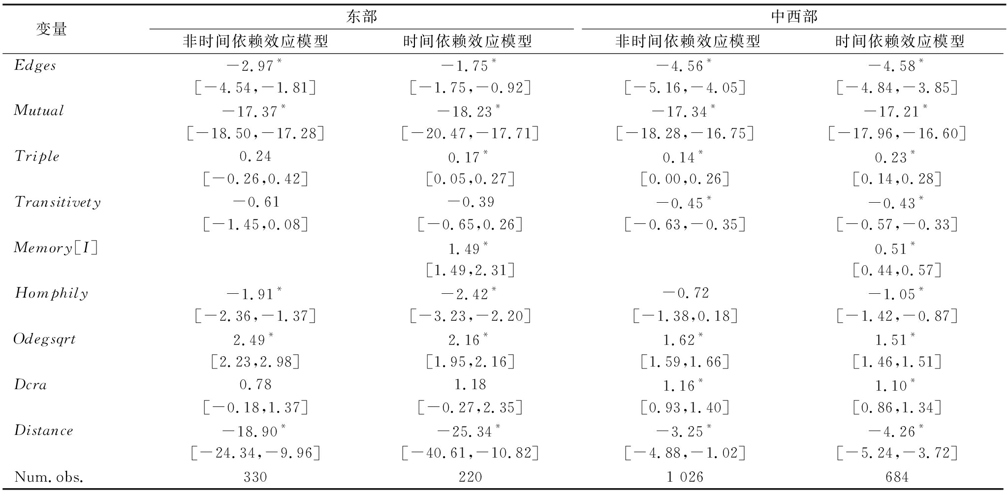 变量东部非时间依赖效应模型时间依赖效应模型中西部非时间依赖效应模型时间依赖效应模型Edges-2.97*-1.75*-4.56*-4.58*[-4.54,-1.81][-1.75,-0.92][-5.16,-4.05][-4.84,-3.85]Mutual-17.37*-18.23*-17.34*-17.21*[-18.50,-17.28][-20.47,-17.71][-18.28,-16.75][-17.96,-16.60]Triple0.240.17*0.14*0.23*[-0.26,0.42][0.05,0.27][0.00,0.26][0.14,0.28]Transitivety-0.61-0.39-0.45*-0.43*[-1.45,0.08][-0.65,0.26][-0.63,-0.35][-0.57,-0.33]Memory[I]1.49*0.51*[1.49,2.31][0.44,0.57]Homphily-1.91*-2.42*-0.72-1.05*[-2.36,-1.37][-3.23,-2.20][-1.38,0.18][-1.42,-0.87]Odegsqrt2.49*2.16*1.62*1.51*[2.23,2.98][1.95,2.16][1.59,1.66][1.46,1.51]Dcra0.781.181.16*1.10*[-0.18,1.37][-0.27,2.35][0.93,1.40][0.86,1.34]Distance-18.90*-25.34*-3.25*-4.26*[-24.34,-9.96][-40.61,-10.82][-4.88,-1.02][-5.24,-3.72]Num.obs.3302201 026684