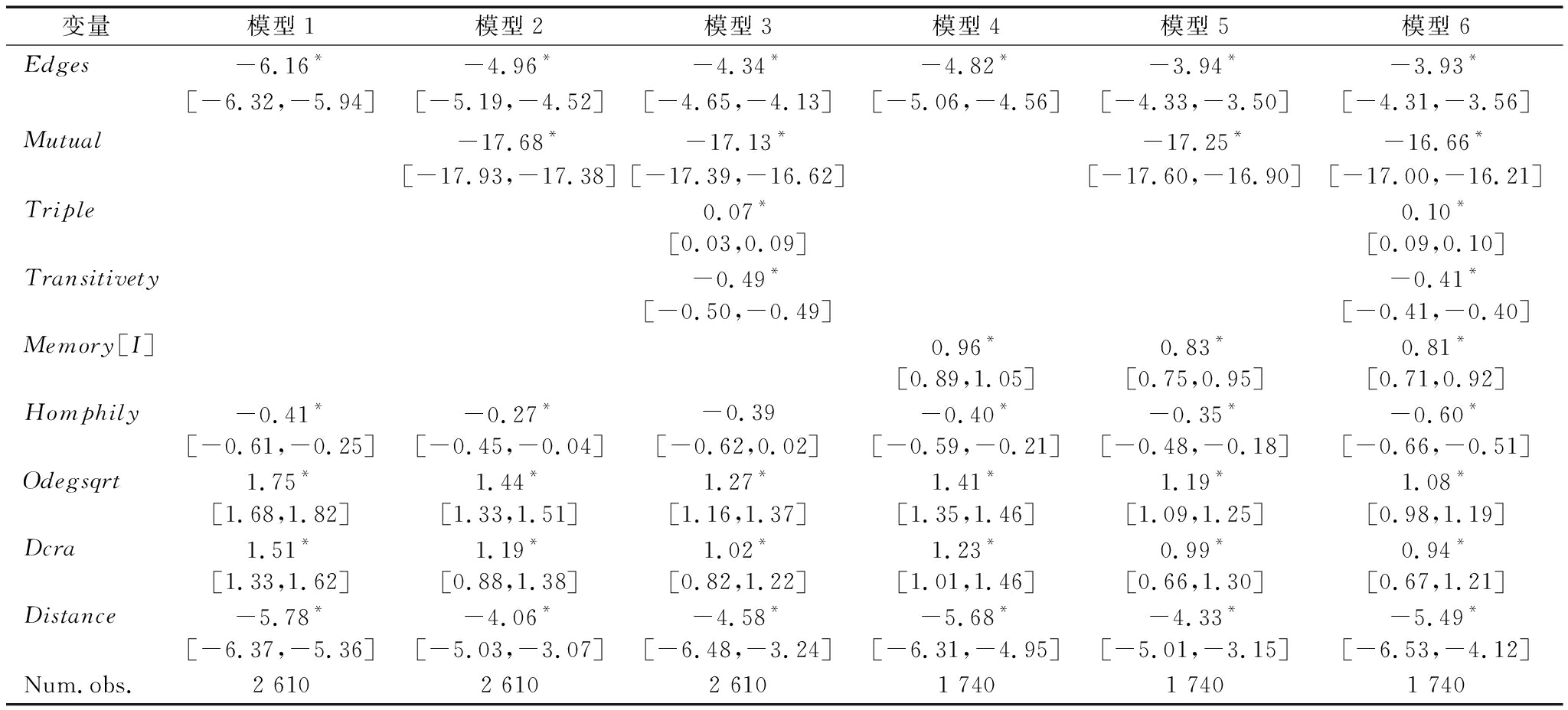 变量模型1模型2模型3模型4模型5模型6Edges-6.16*-4.96*-4.34*-4.82*-3.94*-3.93*[-6.32,-5.94][-5.19,-4.52][-4.65,-4.13][-5.06,-4.56][-4.33,-3.50][-4.31,-3.56]Mutual-17.68*-17.13*-17.25*-16.66*[-17.93,-17.38][-17.39,-16.62][-17.60,-16.90][-17.00,-16.21]Triple0.07*0.10*[0.03,0.09][0.09,0.10]Transitivety-0.49*-0.41*[-0.50,-0.49][-0.41,-0.40]Memory[I]0.96*0.83*0.81*[0.89,1.05][0.75,0.95][0.71,0.92]Homphily-0.41*-0.27*-0.39-0.40*-0.35*-0.60*[-0.61,-0.25][-0.45,-0.04][-0.62,0.02][-0.59,-0.21][-0.48,-0.18][-0.66,-0.51]Odegsqrt1.75*1.44*1.27*1.41*1.19*1.08*[1.68,1.82][1.33,1.51][1.16,1.37][1.35,1.46][1.09,1.25][0.98,1.19]Dcra1.51*1.19*1.02*1.23*0.99*0.94*[1.33,1.62][0.88,1.38][0.82,1.22][1.01,1.46][0.66,1.30][0.67,1.21]Distance-5.78*-4.06*-4.58*-5.68*-4.33*-5.49*[-6.37,-5.36][-5.03,-3.07][-6.48,-3.24][-6.31,-4.95][-5.01,-3.15][-6.53,-4.12]Num.obs.2 6102 6102 6101 7401 7401 740