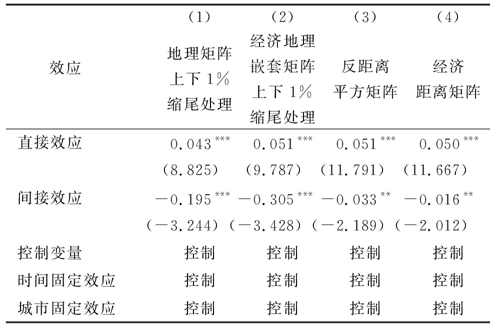 效应 (1)(2)(3)(4)地理矩阵上下1%缩尾处理经济地理嵌套矩阵上下1%缩尾处理反距离平方矩阵经济距离矩阵直接效应0.043***0.051***0.051***0.050***(8.825)(9.787)(11.791)(11.667)间接效应-0.195***-0.305***-0.033**-0.016**(-3.244)(-3.428)(-2.189)(-2.012)控制变量控制控制控制控制时间固定效应控制控制控制控制城市固定效应控制控制控制控制