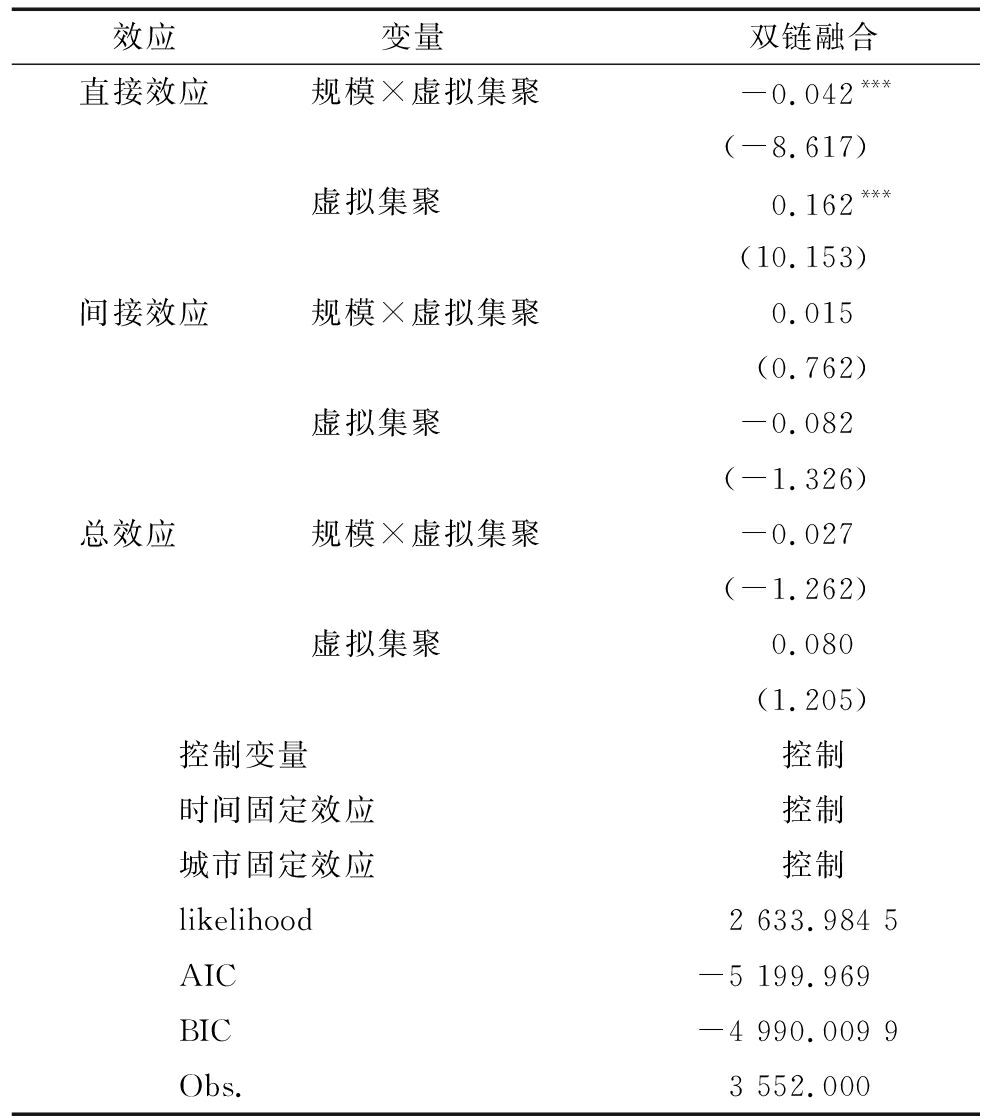效应变量 双链融合直接效应规模×虚拟集聚-0.042*** (-8.617)虚拟集聚0.162*** (10.153)间接效应规模×虚拟集聚0.015 (0.762)虚拟集聚-0.082 (-1.326)总效应 规模×虚拟集聚-0.027 (-1.262)虚拟集聚0.080 (1.205)控制变量控制 时间固定效应控制 城市固定效应控制 likelihood2 633.984 5 AIC-5 199.969 BIC-4 990.009 9Obs.3 552.000