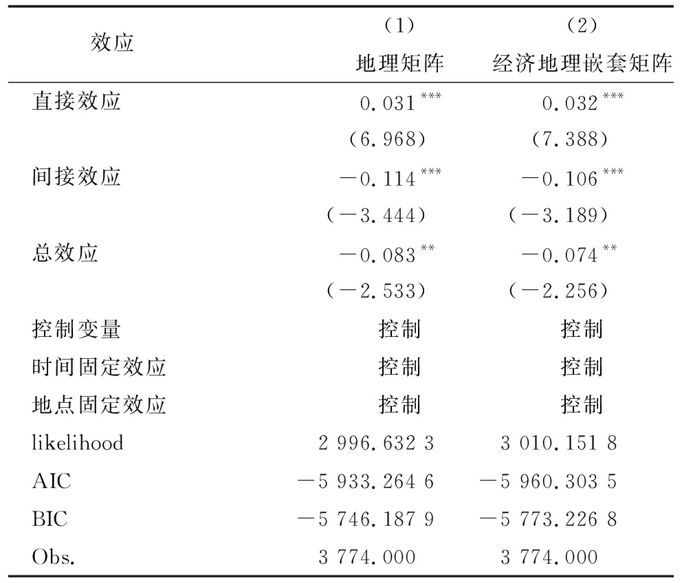 效应 (1)(2)地理矩阵经济地理嵌套矩阵直接效应0.031***0.032*** (6.968) (7.388)间接效应-0.114***-0.106*** (-3.444) (-3.189)总效应-0.083**-0.074** (-2.533) (-2.256)控制变量控制控制时间固定效应控制控制地点固定效应控制控制likelihood2 996.632 33 010.151 8AIC -5 933.264 6-5 960.303 5BIC -5 746.187 9-5 773.226 8Obs.3 774.0003 774.000