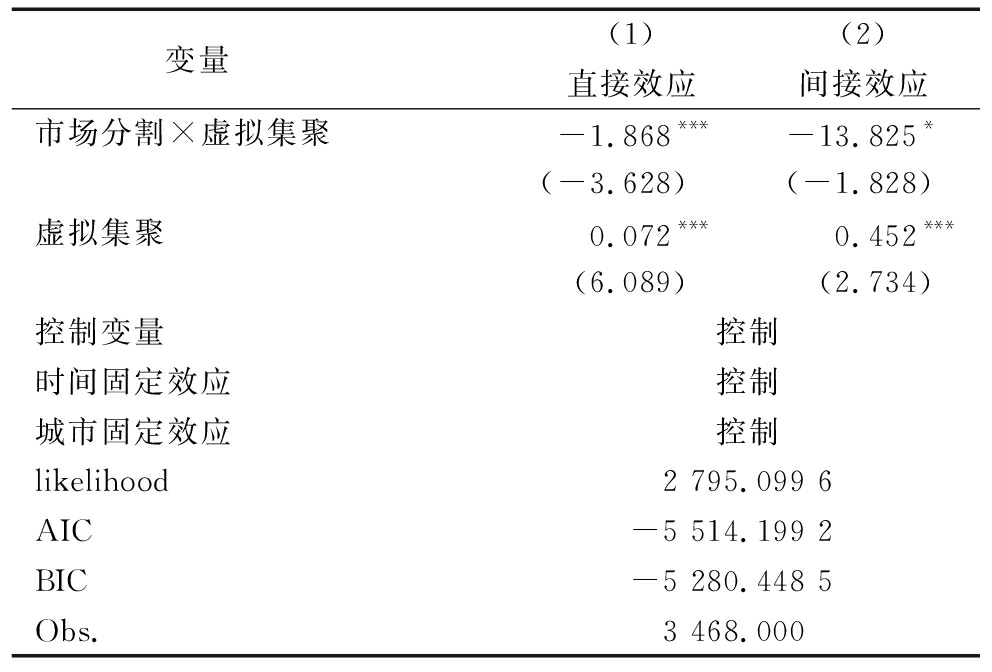 变量 (1)(2)直接效应间接效应市场分割×虚拟集聚-1.868***-13.825* (-3.628) (-1.828)虚拟集聚0.072***0.452*** (6.089) (2.734)控制变量控制时间固定效应控制城市固定效应控制likelihood2 795.099 6AIC-5 514.199 2BIC-5 280.448 5Obs.3 468.000