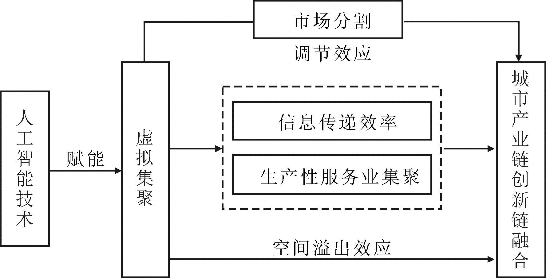 虚拟集聚与城市双链融合关联研究虽处于探索阶段,但部分研究揭示了二者互动关系。在理论层面,学者普遍认为,虚拟集聚通过打破地理限制,为产业链上下游企业与创新链主体搭建跨域协作平台,这种组织形态革新为双链要素精准匹配创造了条件。在实证研究方面,部分学者发现,虚拟集聚程度较高城市产业专利转化率与高新技术产业产值占比显著提升[14],在一定程度上反映产业链与创新链的协同效能。此外,在对产业链与创新链融合区域差异及空间关联研究中,有学者发现地理距离和市场壁垒不仅会直接限制产业链跨区域延伸,还会通过削弱知识溢出效率抑制创新链辐射[15]。值得注意的是,在人工智能技术强化数字平台和弱化地理距离背景下,市场分割对双链融合的抑制作用是否依然显著,这为解析虚拟集聚与双链融合关系提供了关键调节视角,有待进一步验证。总之,上述研究为本文提供了坚实的理论基础,但存在如下不足:①在理论框架上,未将虚拟集聚系统纳入双链融合实证研究体系,尤其缺乏人工智能背景下对二者互动机制的深度解构,难以回应数字技术革命对产业协同模式的重塑作用。②在研究尺度上,现有研究多停留在省级层面,对地级市双链融合水平的测度及空间演化特征的关注不足,难以支撑城市精准施策需求。③在机制检验上,对虚拟集聚影响双链融合传导路径缺乏实证检验,且未剖析空间溢出效应。④在情境分析上,忽视了市场分割等制度因素的调节作用,也未探讨城市规模差异带来的异质性影响,导致对虚拟集聚效应边界条件的认知比较模糊。