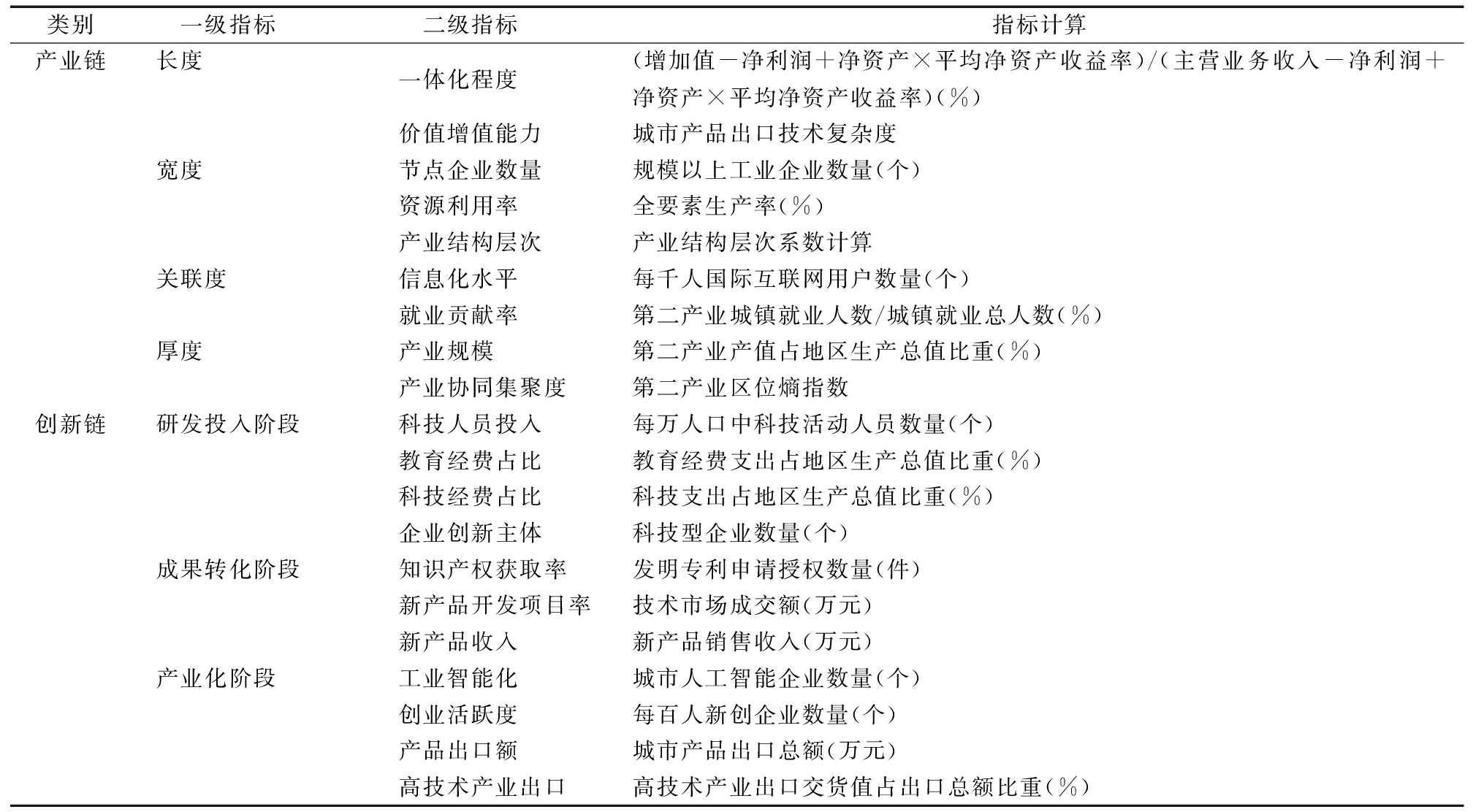 类别一级指标 二级指标 指标计算产业链长度一体化程度(增加值-净利润+净资产×平均净资产收益率)/(主营业务收入-净利润+净资产×平均净资产收益率)(%)价值增值能力城市产品出口技术复杂度宽度节点企业数量规模以上工业企业数量(个)资源利用率全要素生产率(%)产业结构层次产业结构层次系数计算关联度信息化水平每千人国际互联网用户数量(个)就业贡献率第二产业城镇就业人数/城镇就业总人数(%)厚度产业规模第二产业产值占地区生产总值比重(%)产业协同集聚度第二产业区位熵指数创新链研发投入阶段科技人员投入每万人口中科技活动人员数量(个)教育经费占比教育经费支出占地区生产总值比重(%)科技经费占比科技支出占地区生产总值比重(%)企业创新主体科技型企业数量(个)成果转化阶段知识产权获取率发明专利申请授权数量(件)新产品开发项目率技术市场成交额(万元)新产品收入新产品销售收入(万元)产业化阶段工业智能化城市人工智能企业数量(个)创业活跃度每百人新创企业数量(个)产品出口额城市产品出口总额(万元)高技术产业出口高技术产业出口交货值占出口总额比重(%)