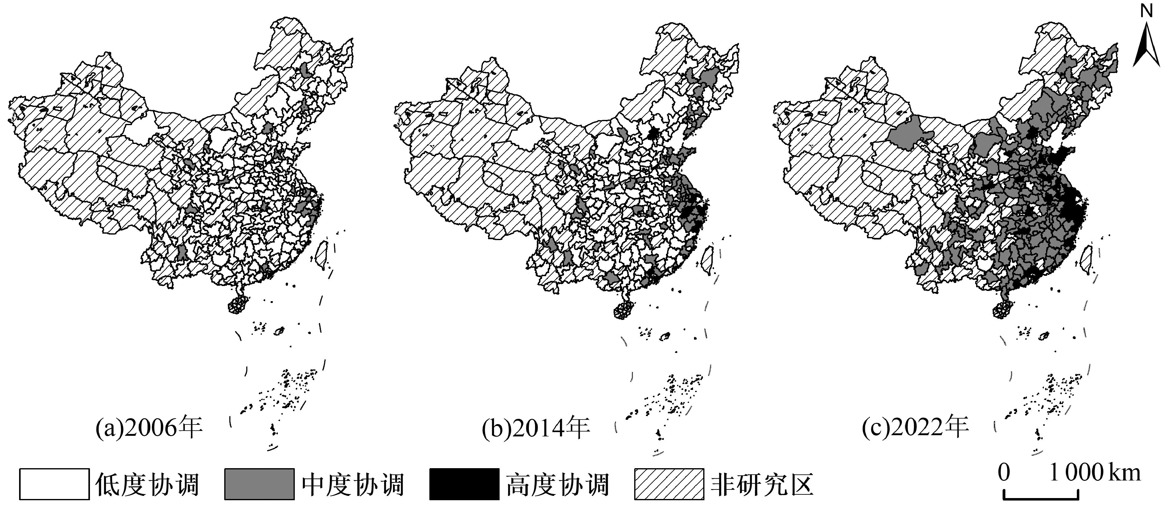 为进一步探究城市双链耦合协调度的时空特征和地区差异,以2006年、2014年和2022年中国城市产业链与创新链耦合协调度指数为基础,利用ArcGIS软件对3个年度各城市进行等级划分,得到城市产业链创新链融合空间演化格局(见图2)。从全国看,2006—2022年中国双链耦合协调度呈稳步增长态势,实现从相对失衡到较为协调的阶段转变。具体而言,2006—2014年,低度协调城市数量逐步减少,中度协调城市空间分布相对分散,沿海地区部分城市呈高度协调,这一时期中国城市双链耦合协调度整体空间发展态势趋向均衡。2014—2022年,低度协调城市逐步转化为中度协调城市,高度协调城市数量显著增加,且出现集中连片区域。分区域看,2022年,中国城市双链融合水平在不同区域间存在显著差异,呈现出东高—中次—西低的空间分布格局。东部地区经济基础雄厚,市场环境优越,吸引了大量国内外投资和创新资源。良好的市场环境和产业基础促进创新成果快速转化和产业化,创新链与产业链融合水平显著提升。以上海、杭州、苏州等城市为代表的长三角城市群,以广州、深圳等城市为代表的珠三角城市群,以青岛、济南、烟台为代表的山东半岛城市群在双链融合方面表现突出。这表明,东部地区城市群通过中心城市与周边城市协同合作,形成高效的创新与产业联动机制,在区域双链融合中发挥显著引领作用。此外,长春、沈阳、武汉、长沙、西安、福州、太原等省会城市在全国范围内也处于相对优先水平。这些城市借助其在区域内的行政、教育和科研资源集聚优势,成为区域创新中心,推动本地产业链与创新链融合发展[32]。