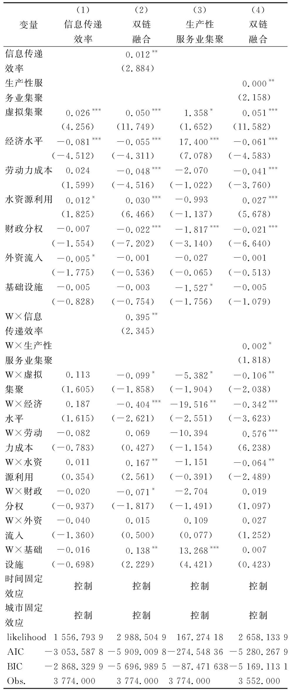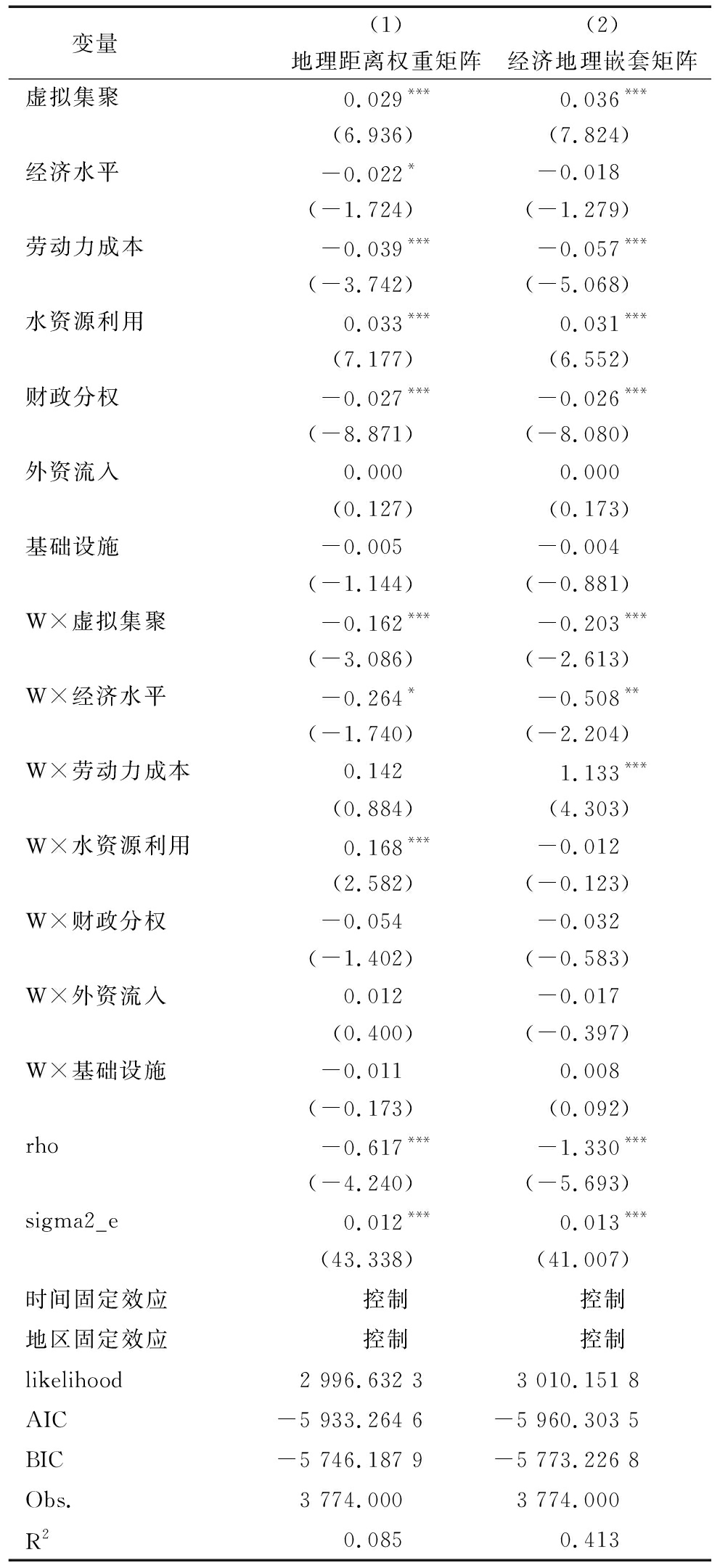 变量 (1)(2)地理距离权重矩阵经济地理嵌套矩阵虚拟集聚0.029***0.036*** (6.936) (7.824)经济水平-0.022*-0.018 (-1.724) (-1.279)劳动力成本-0.039***-0.057*** (-3.742) (-5.068)水资源利用0.033***0.031*** (7.177) (6.552)财政分权-0.027***-0.026*** (-8.871) (-8.080)外资流入0.0000.000 (0.127) (0.173)基础设施-0.005-0.004 (-1.144) (-0.881)W×虚拟集聚-0.162***-0.203*** (-3.086) (-2.613)W×经济水平-0.264*-0.508** (-1.740) (-2.204)W×劳动力成本0.1421.133*** (0.884) (4.303)W×水资源利用0.168***-0.012 (2.582) (-0.123)W×财政分权-0.054-0.032 (-1.402) (-0.583)W×外资流入0.012-0.017 (0.400) (-0.397)W×基础设施-0.0110.008 (-0.173) (0.092)rho-0.617***-1.330*** (-4.240) (-5.693)sigma2_e0.012***0.013*** (43.338) (41.007)时间固定效应控制控制地区固定效应控制控制likelihood2 996.632 33 010.151 8AIC-5 933.264 6-5 960.303 5BIC-5 746.187 9-5 773.226 8Obs.3 774.0003 774.000R20.0850.413