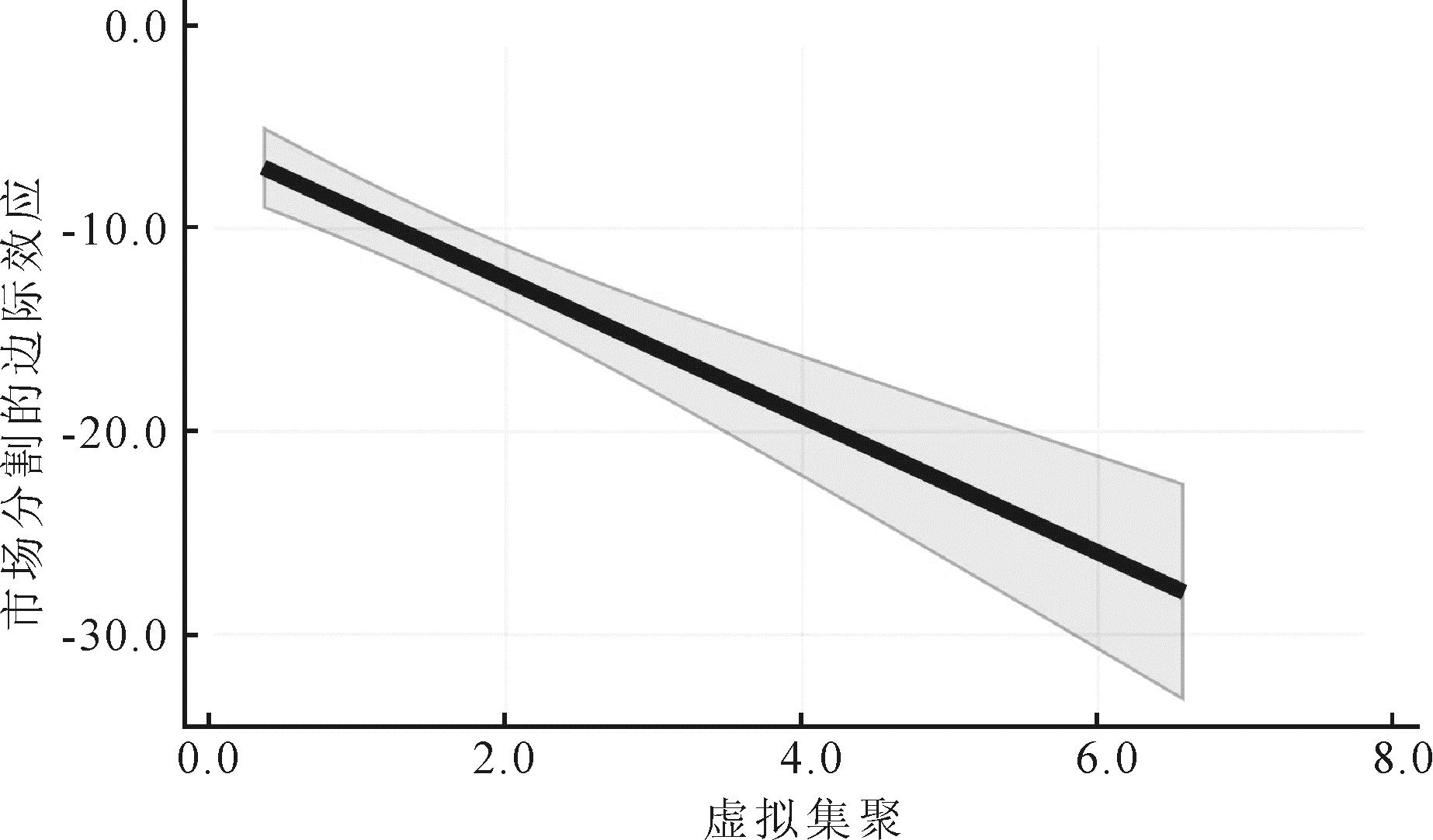 为揭示市场分割对虚拟集聚与双链融合关系的边界条件,本研究将市场分割指数作为调节变量引入模型,构建虚拟集聚与市场分割的交互项(市场分割_虚拟集聚),并基于空间杜宾模型分解直接效应与间接效应。表9列(1)(2)结果显示,市场分割与虚拟集聚交互项的直接效应系数为-1.868,间接效应系数-13.825,均呈显著负向影响,假设H5得以验证。市场分割调节效应进一步显示,当虚拟集聚明显时,市场分割边际效应负向绝对值增大,虚拟集聚驱动双链融合的正向关系被大幅削弱(见图3)。市场分割的负向调节作用主要源于其对资源空间的负向抑制效应:行政壁垒(如地方保护主义)和制度壁垒(如异地投资限制)等市场分割因素会阻碍资源在区域间自由流动,削弱虚拟集聚平台的资源整合能力,割裂产业创新网络结构,进而抑制创新链与产业链之间的协同效应[41]。可见,只有在良好的统一大市场建设下,虚拟集聚才能更好地发挥对城市产业链创新链的协调耦合作用。