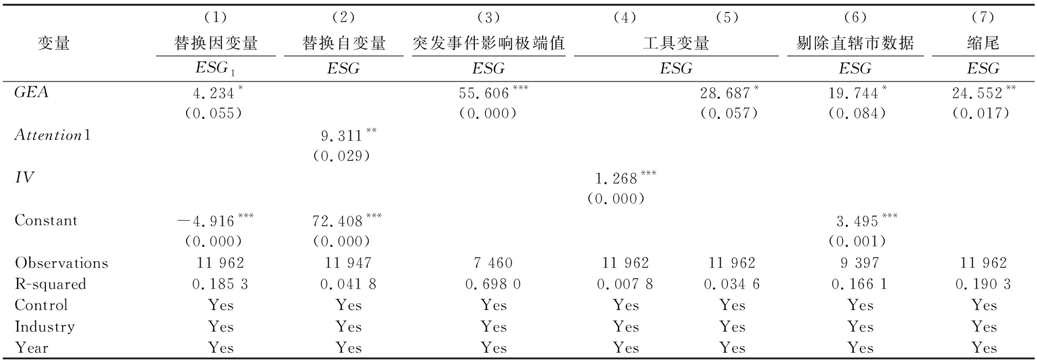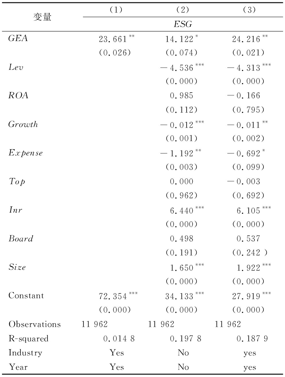 变量(1)(2)(3)ESGGEA23.661**14.122*24.216**(0.026)(0.074)(0.021)Lev-4.536***-4.313***(0.000)(0.000)ROA0.985-0.166(0.112)(0.795)Growth-0.012***-0.011**(0.001)(0.002)Expense-1.192**-0.692*(0.003)(0.099)Top0.000-0.003(0.962)(0.692)Inr6.440***6.105***(0.000)(0.000)Board0.4980.537(0.191)(0.242 )Size1.650***1.922***(0.000)(0.000)Constant72.354***34.133***27.919***(0.000)(0.000)(0.000)Observations11 96211 96211 962R-squared0.014 80.197 80.187 9IndustryYesNoyesYear YesNoyes