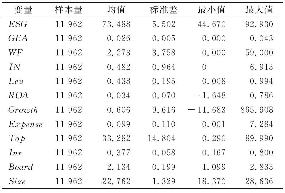 表2为描述性统计的结果。企业ESG表现的均值为73.488,标准差为5.502,表明样本企业ESG绩效差异较大,为本文实证分析提供了基础。政府环境关注度(GEA)的均值为0.026,标准差为0.005。高管团队环保意识(WF)的均值为2.273,标准差为3.758,说明企业间高管团队环保意识水平存在明显差异。同时,GEA、WF、IN存在数值为零的情况,说明在政府环境关注度、高管团队环保意识和企业创新方面存在表现较差样本。
