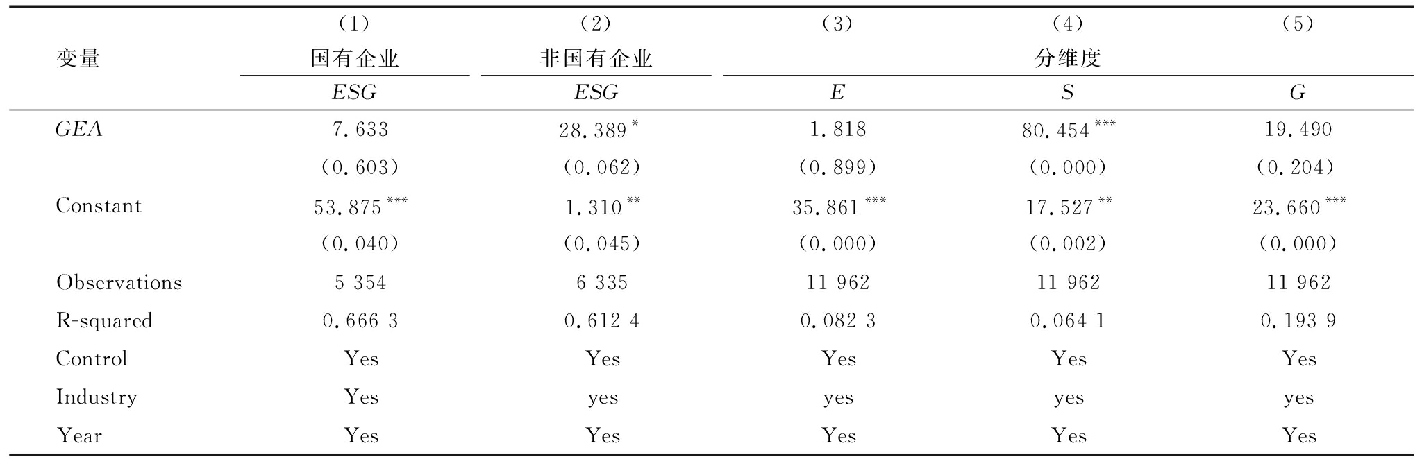 变量(1)国有企业ESG(2)非国有企业ESG(3)(4)(5)分维度ESGGEA7.63328.389*1.81880.454***19.490(0.603)(0.062)(0.899)(0.000)(0.204)Constant53.875***1.310**35.861***17.527**23.660***(0.040)(0.045)(0.000)(0.002)(0.000)Observations5 3546 33511 96211 96211 962R-squared0.666 30.612 40.082 30.064 10.193 9ControlYesYesYesYesYesIndustryYesyesyesyesyesYear YesYesYesYesYes
