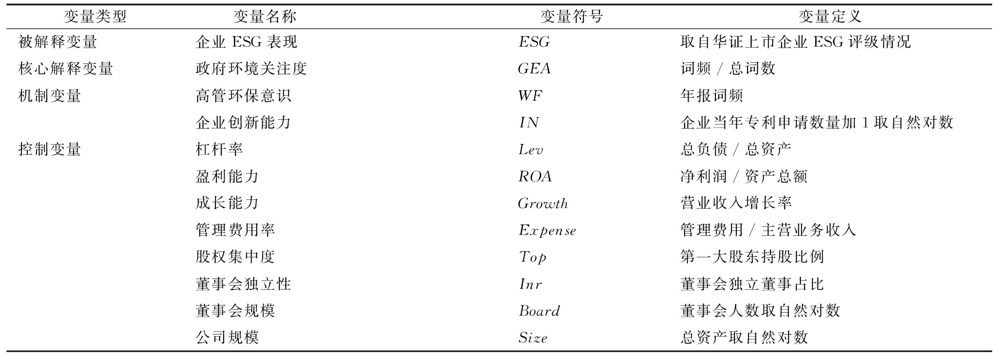 本文从CSMAR数据库中提取2015—2022年中国A股上市公司作为研究样本,并根据以下标准对样本进行筛选:第一,剔除金融公司样本。金融行业企业运作模式、监管环境与一般企业存在显著差异,其ESG表现的驱动因素和表现形式也不同。为了减少行业特性对研究结果的干扰,本文剔除金融行业样本。第二,剔除ST、*ST、PT、SST公司样本。上述企业通常面临财务问题,可能无法准确反映政府环境关注度对企业ESG表现的影响。第三,剔除数据不足5年的企业样本。为了保证数据的连续性和时间序列的完整性,本文仅保留数据完整的企业样本。第四,剔除数据缺失和异常的企业样本。为了确保数据的准确性和可靠性,本文剔除存在缺失值或异常值的企业样本。经过上述处理步骤,本文最终得到11 962个观测值,采用Stata17.0软件对数据进行处理与回归。