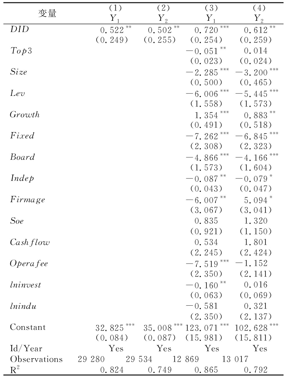变量(1)(2)(3)(4)Y1Y2Y1Y2DID0.522**0.502**0.720***0.612**(0.249)(0.255)(0.254)(0.259)Top3-0.051**0.014(0.023)(0.024)Size-2.285***-3.200***(0.500)(0.465)Lev-6.006***-5.445***(1.558)(1.573)Growth1.354***0.883**(0.491)(0.518)Fixed-7.262***-6.845***(2.308)(2.323)Board-4.866***-4.166***(1.573)(1.604)Indep-0.087**-0.079*(0.043)(0.047)Firmage-6.007**5.094*(3.067)(3.041)Soe0.8351.320(0.921)(1.150)Cashflow0.5341.801(2.245)(2.424)Operafee-7.519***-1.152(2.350)(2.141)lninvest-0.160**0.016(0.063)(0.069)lnindu-0.5810.321(2.350)(2.137)Constant32.825***35.008***123.071***102.628***(0.084)(0.087)(15.981)(15.811)Id/YearYesYesYesYesObservations29 28029 53412 86913 017R20.8240.7490.8650.792