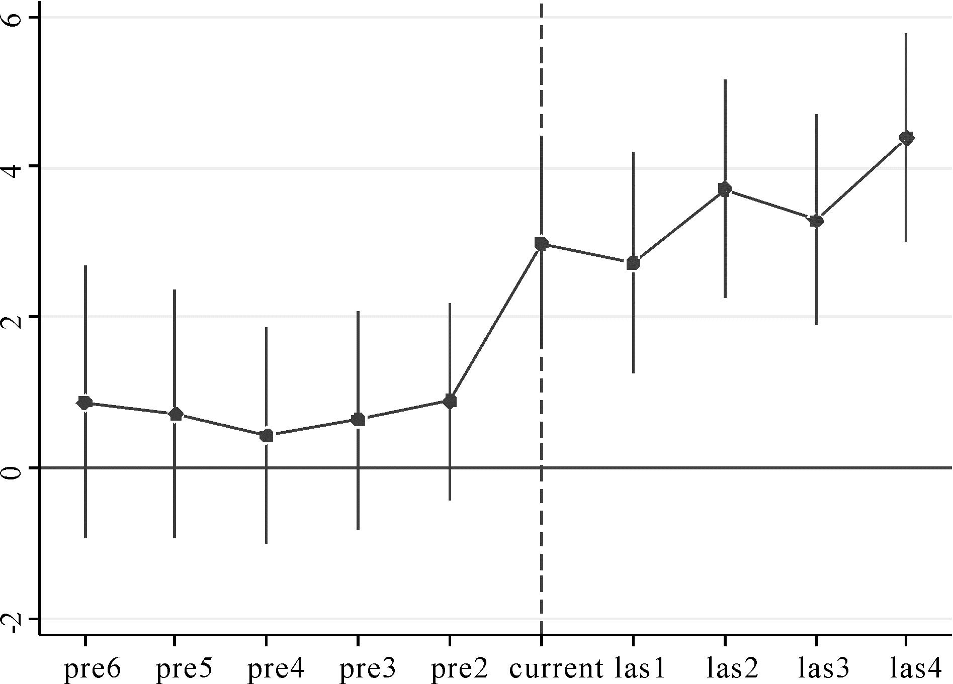 考虑时间和企业固定效应后纳入控制变量,基准模型估计结果见表3。由表3可知,列(1)~(4)中DID的估计系数在5%水平上显著为正,表明美国对华科技“脱钩”政策显著促进中国企业供应链韧性提升。其中,列(3)中DID估计系数为0.720,意味着美国对华科技“脱钩”政策每增加一个标准差会使中国企业供应链韧性提升约31.97%。列(4)中DID估计系数为0.612,意味着美国对华科技“脱钩”政策每增加一个标准差会使中国企业供应链韧性提升约27.17%。可见,美国对华科技“脱钩”政策对中国企业供应链韧性的影响不容忽视。上述结果表明,美国对华科技“脱钩”政策能够显著促进中国企业供应链韧性提升,假设H1得到验证。