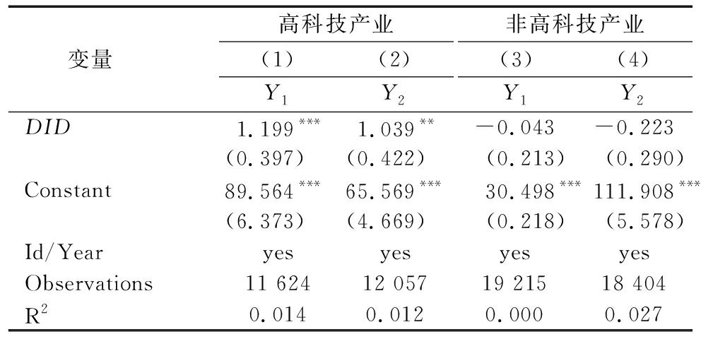 变量 高科技产业(1)(2)Y1Y2非高科技产业(3)(4)Y1Y2DID1.199***1.039**-0.043-0.223(0.397)(0.422)(0.213)(0.290)Constant89.564***65.569***30.498***111.908***(6.373)(4.669)(0.218)(5.578)Id/YearyesyesyesyesObservations11 62412 05719 21518 404R20.0140.0120.0000.027