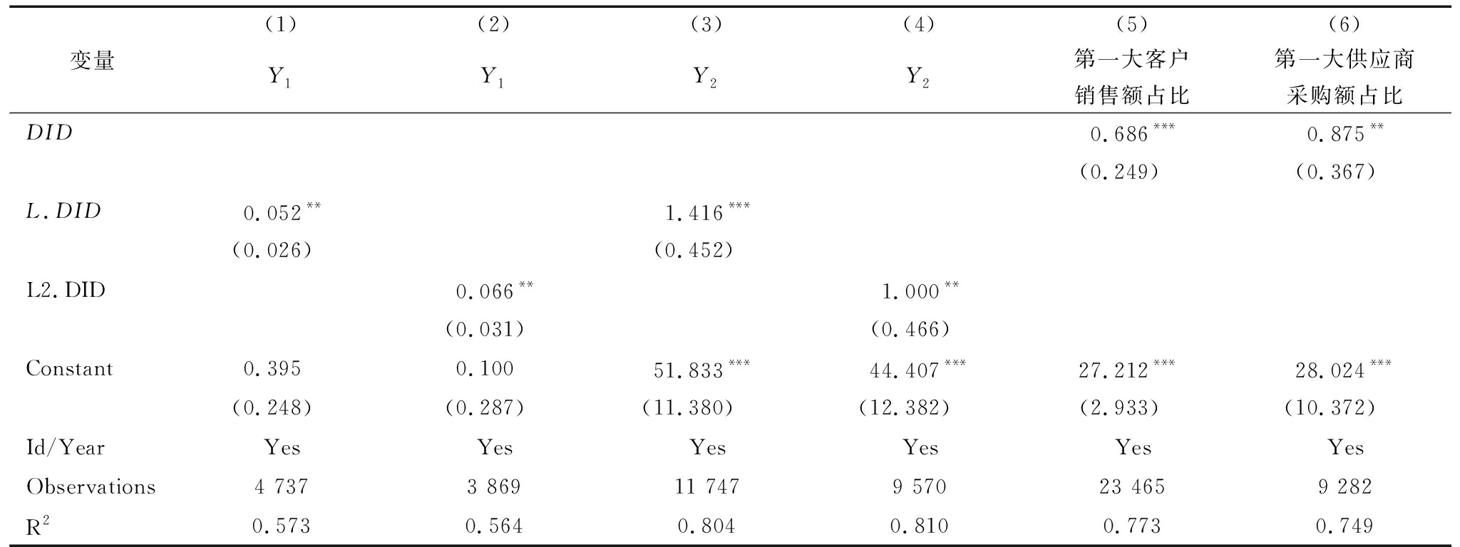 变量(1)(2)(3)(4)(5)(6)Y1Y1Y2Y2第一大客户销售额占比第一大供应商采购额占比DID0.686***0.875**(0.249)(0.367)L.DID0.052**1.416***(0.026)(0.452)L2.DID0.066**1.000**(0.031)(0.466)Constant0.3950.10051.833***44.407***27.212***28.024***(0.248)(0.287)(11.380)(12.382)(2.933)(10.372)Id/YearYesYesYesYesYesYesObservations4 7373 86911 7479 57023 4659 282R20.5730.5640.8040.8100.7730.749