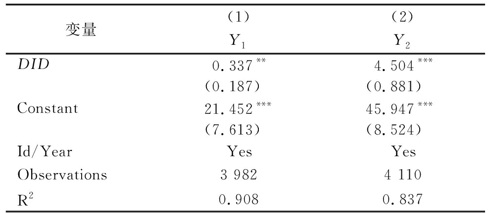 变量(1)(2)Y1Y2DID0.337**4.504***(0.187)(0.881)Constant21.452***45.947***(7.613)(8.524)Id/YearYesYesObservations3 9824 110R20.9080.837