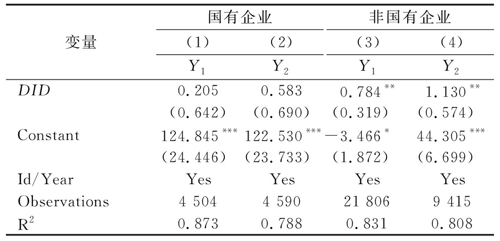 变量国有企业(1)(2)Y1Y2非国有企业(3)(4)Y1Y2DID0.2050.5830.784**1.130**(0.642)(0.690)(0.319)(0.574)Constant124.845***122.530***-3.466*44.305***(24.446)(23.733)(1.872)(6.699)Id/YearYesYesYesYesObservations4 5044 59021 8069 415R20.8730.7880.8310.808