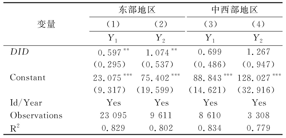 变量东部地区(1)(2)Y1Y2中西部地区(3)(4)Y1Y2DID0.597**1.074**0.6991.267(0.295)(0.537)(0.486)(0.947)Constant23.075***75.402***88.843***128.027***(9.317)(19.599)(14.621)(32.916)Id/YearYesYesYesYesObservations23 0959 6118 6103 308R20.8290.8020.8340.779