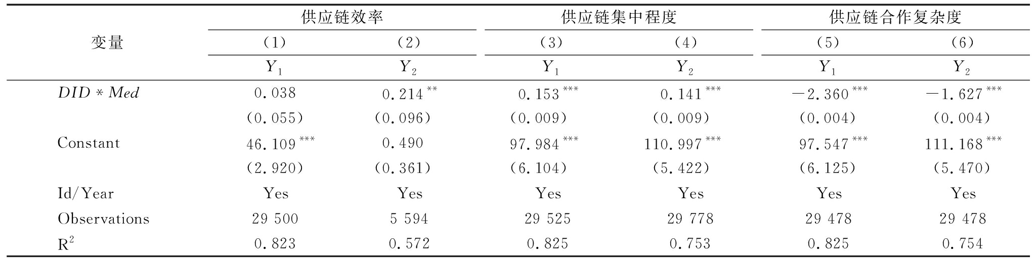 变量供应链效率(1)(2)Y1Y2供应链集中程度(3)(4)Y1Y2供应链合作复杂度(5)(6)Y1Y2DID*Med0.0380.214**0.153***0.141***-2.360***-1.627***(0.055)(0.096)(0.009)(0.009)(0.004)(0.004)Constant46.109***0.49097.984***110.997***97.547***111.168***(2.920)(0.361)(6.104)(5.422)(6.125)(5.470)Id/YearYesYesYesYesYesYesObservations29 5005 59429 52529 77829 47829 478R20.8230.5720.8250.7530.8250.754