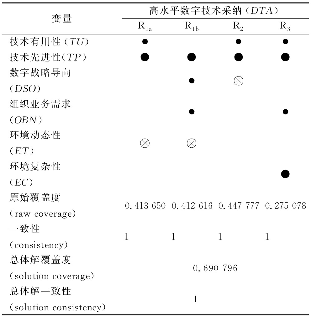 变量高水平数字技术采纳(DTA)R1aR1bR2R3技术有用性(TU)●●●技术先进性(TP)●●●●数字战略导向(DSO)●组织业务需求(OBN)●●环境动态性(ET)环境复杂性(EC)●原始覆盖度(raw coverage)0.413 6500.412 6160.447 7770.275 078一致性(consistency)1111总体解覆盖度(solution coverage)0.690 796总体解一致性(solution consistency)1