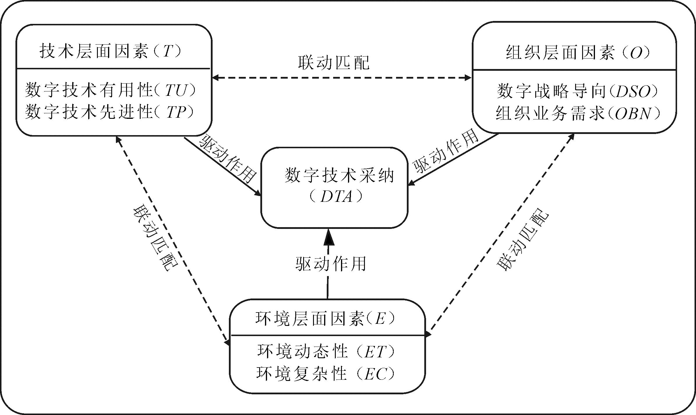由上述分析可知,技术、组织与环境层面要素均对企业数字技术采纳存在影响,技术层面影响因素(T)包括技术有用性(TU)和技术先进性(TP),组织层面影响因素(O)包括数字战略导向(DSO)和组织业务需求(OBN),环境层面影响因素(E)包括环境动态性(ET)和环境复杂性(EC)。