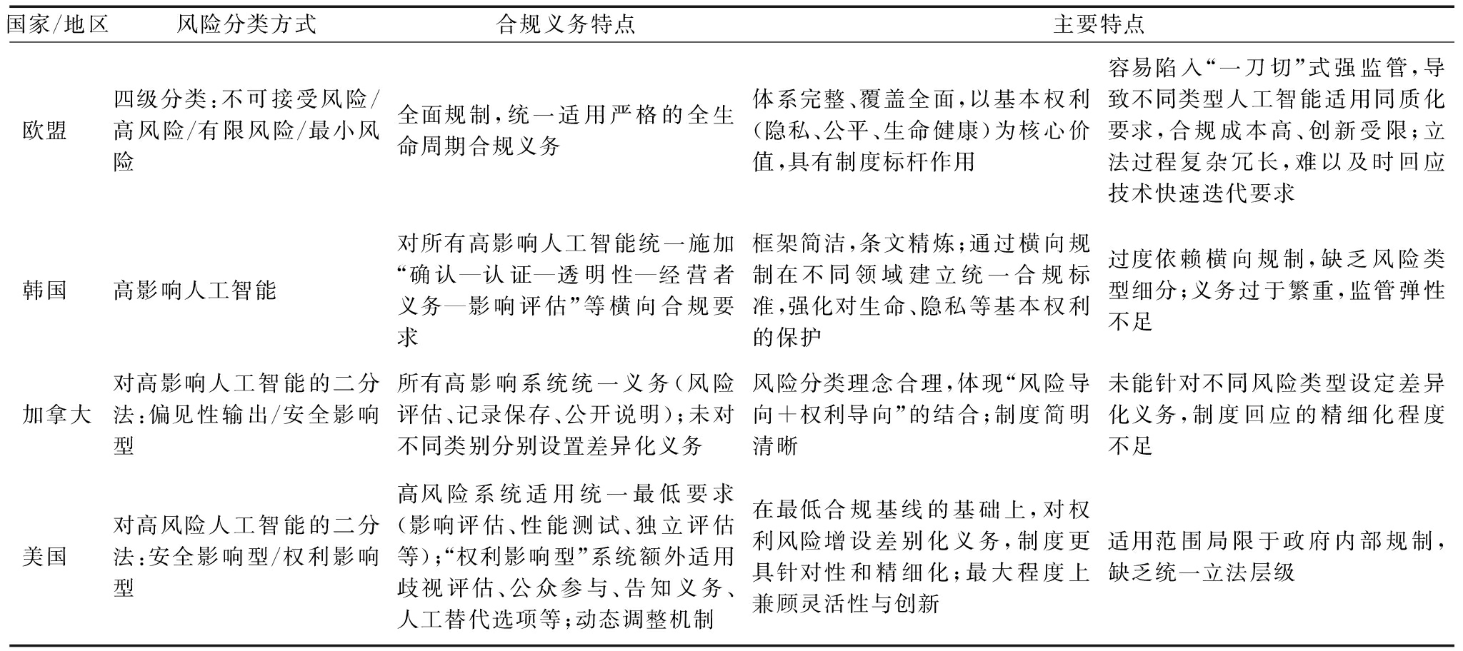 国家/地区风险分类方式合规义务特点 主要特点欧盟 四级分类:不可接受风险/高风险/有限风险/最小风险全面规制,统一适用严格的全生命周期合规义务体系完整、覆盖全面,以基本权利(隐私、公平、生命健康)为核心价值,具有制度标杆作用容易陷入“一刀切”式强监管,导致不同类型人工智能适用同质化要求,合规成本高、创新受限;立法过程复杂冗长,难以及时回应技术快速迭代要求韩国 高影响人工智能对所有高影响人工智能统一施加“确认—认证—透明性—经营者义务—影响评估”等横向合规要求框架简洁,条文精炼;通过横向规制在不同领域建立统一合规标准,强化对生命、隐私等基本权利的保护过度依赖横向规制,缺乏风险类型细分;义务过于繁重,监管弹性不足加拿大对高影响人工智能的二分法:偏见性输出/安全影响型所有高影响系统统一义务(风险评估、记录保存、公开说明);未对不同类别分别设置差异化义务风险分类理念合理,体现“风险导向+权利导向”的结合;制度简明清晰未能针对不同风险类型设定差异化义务,制度回应的精细化程度不足美国 对高风险人工智能的二分法:安全影响型/权利影响型高风险系统适用统一最低要求(影响评估、性能测试、独立评估等);“权利影响型”系统额外适用歧视评估、公众参与、告知义务、人工替代选项等;动态调整机制在最低合规基线的基础上,对权利风险增设差别化义务,制度更具针对性和精细化;最大程度上兼顾灵活性与创新适用范围局限于政府内部规制,缺乏统一立法层级