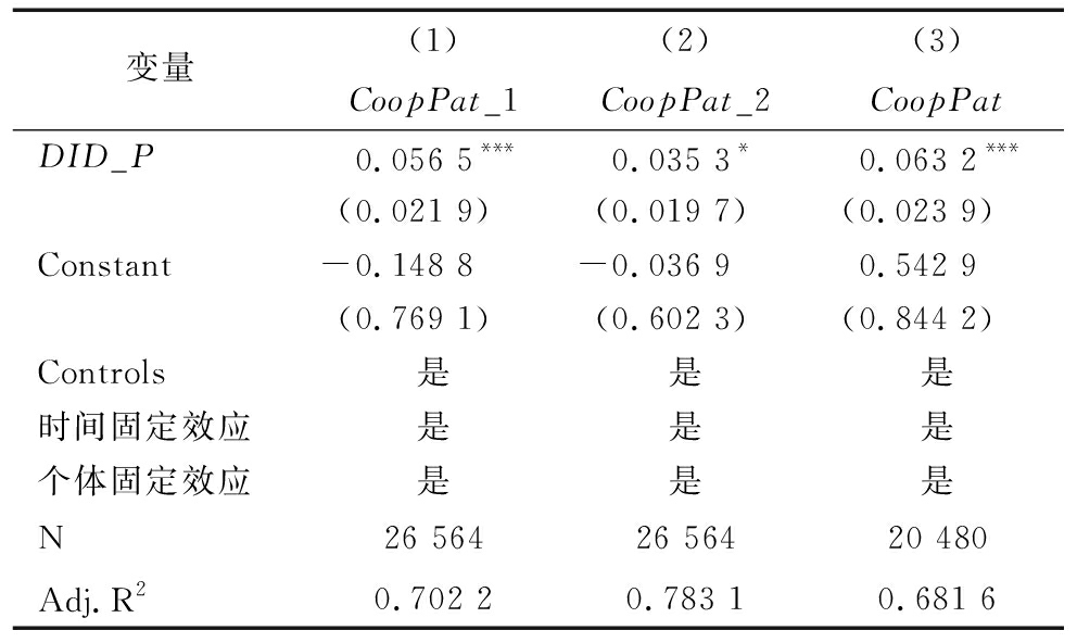 变量(1)(2)(3)CoopPat_1CoopPat_2CoopPatDID_P0.056 5***0.035 3*0.063 2***(0.021 9)(0.019 7)(0.023 9)Constant-0.148 8-0.036 90.542 9(0.769 1)(0.602 3)(0.844 2)Controls是是是时间固定效应是是是个体固定效应是是是N26 56426 56420 480Adj.R20.702 20.783 10.681 6