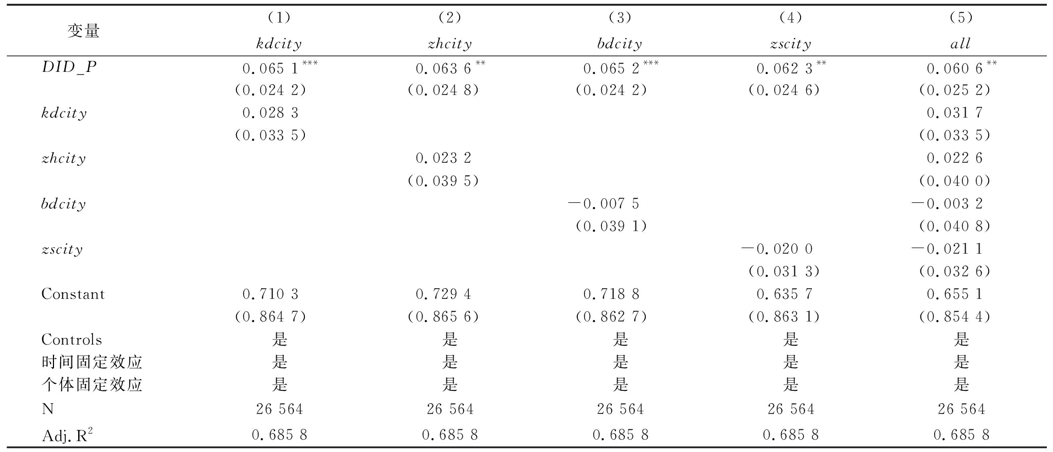 变量 (1)(2)(3)(4)(5)kdcityzhcitybdcityzscityallDID_P0.065 1***0.063 6**0.065 2***0.062 3**0.060 6**(0.024 2)(0.024 8)(0.024 2)(0.024 6)(0.025 2)kdcity0.028 30.031 7(0.033 5)(0.033 5)zhcity0.023 20.022 6(0.039 5)(0.040 0)bdcity-0.007 5-0.003 2(0.039 1)(0.040 8)zscity-0.020 0-0.021 1(0.031 3)(0.032 6)Constant0.710 30.729 40.718 80.635 70.655 1(0.864 7)(0.865 6)(0.862 7)(0.863 1)(0.854 4)Controls是是是是是时间固定效应是是是是是个体固定效应是是是是是N26 56426 56426 56426 56426 564Adj.R20.685 80.685 80.685 80.685 80.685 8