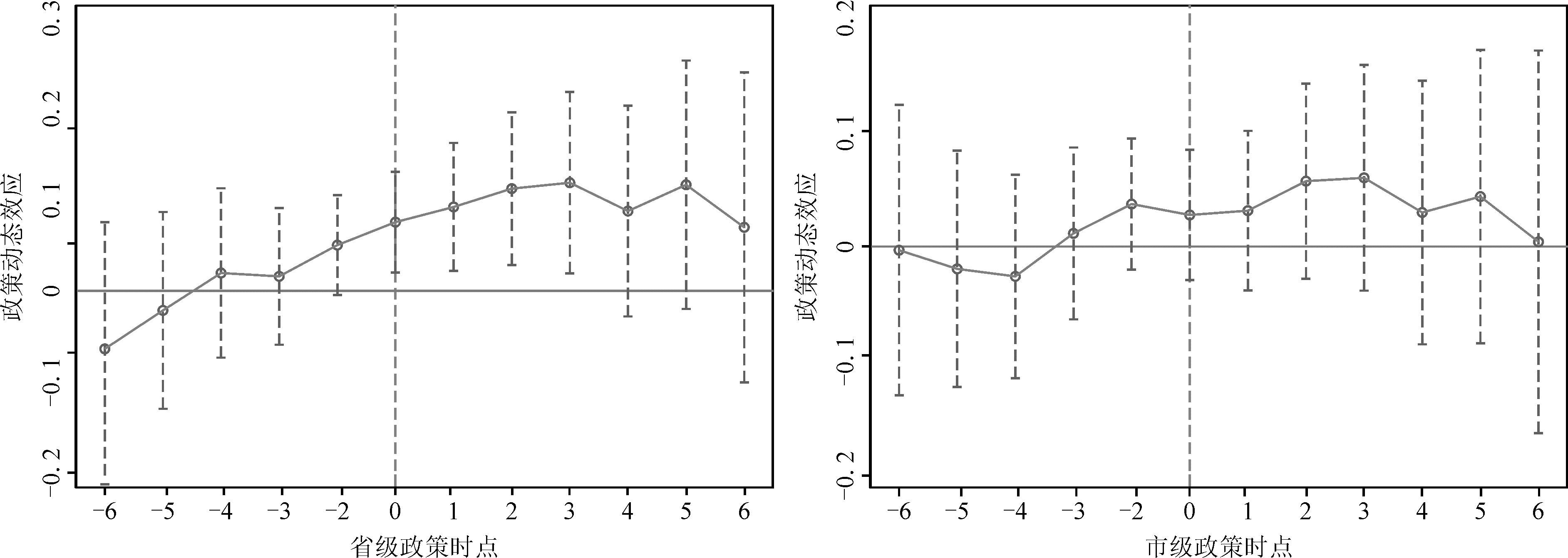 其中,n代表公共数据开放平台上线后的第n年,n=0代表平台上线当年。为避免多重共线性问题,本文以平台上线前一年为基期,其余变量设定与模型(1)相同。图3展示了省、市两级平台的平行趋势检验结果,两级政策实施前各期系数估计值不显著,即省、市两级平台模型均通过平行趋势检验,符合DID模型设定要求。此外,省级平台在上线后第1-3期估计系数显著为正,从第4期开始政策效果波动直至消失,因此应重视省级公共数据开放政策效果的可持续性。而市级平台在上线后各期均不显著,说明市级公共数据开放对企业联合创新的动态影响不显著。