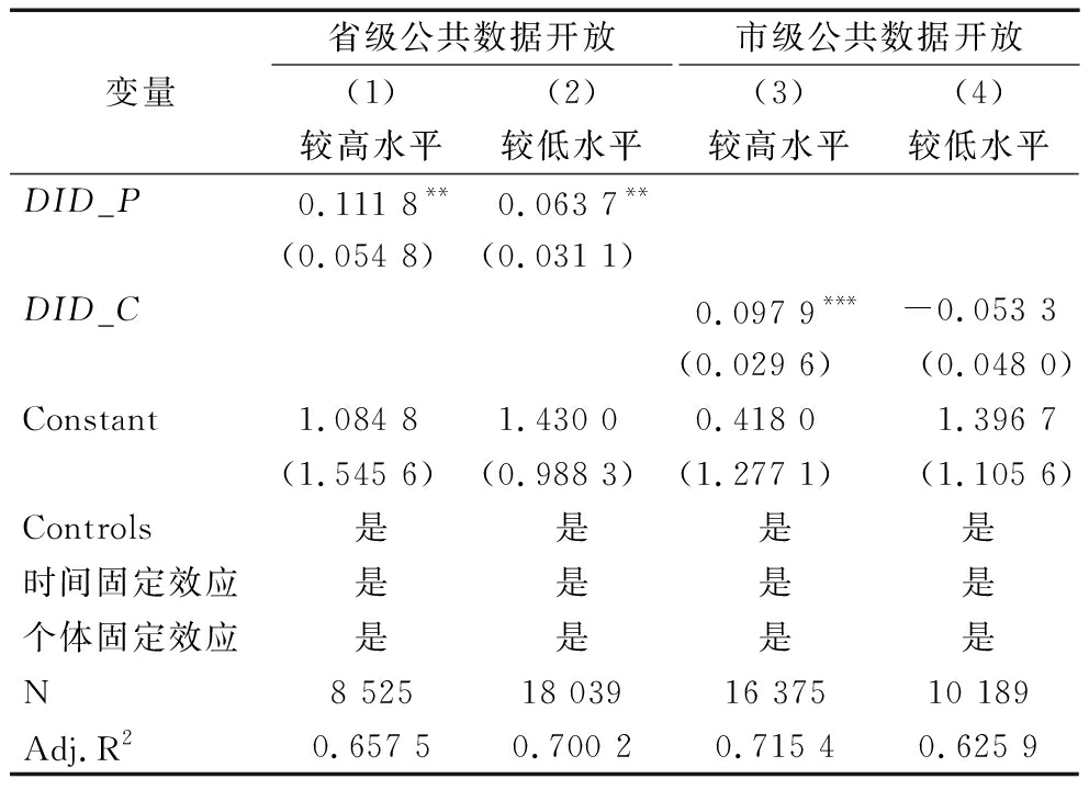 变量省级公共数据开放(1)(2)较高水平较低水平市级公共数据开放(3)(4)较高水平较低水平DID_P0.111 8**0.063 7**(0.054 8)(0.031 1)DID_C0.097 9***-0.053 3(0.029 6)(0.048 0)Constant1.084 81.430 00.418 01.396 7(1.545 6)(0.988 3)(1.277 1)(1.105 6)Controls是是是是时间固定效应是是是是个体固定效应是是是是N8 52518 03916 37510 189Adj.R20.657 50.700 20.715 40.625 9