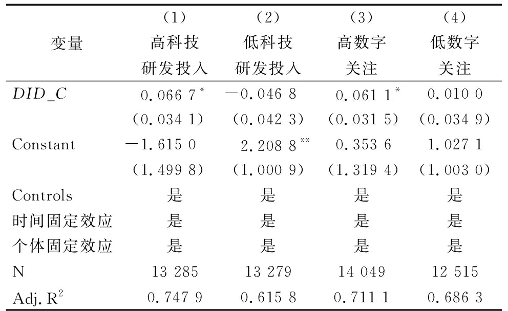 变量(1)(2)(3)(4)高科技研发投入低科技研发投入高数字关注低数字关注DID_C0.066 7*-0.046 8 0.061 1*0.010 0(0.034 1)(0.042 3)(0.031 5)(0.034 9)Constant-1.615 02.208 8**0.353 61.027 1(1.499 8)(1.000 9)(1.319 4)(1.003 0)Controls是是是是时间固定效应是是是是个体固定效应是是是是N13 28513 27914 04912 515Adj.R20.747 90.615 80.711 10.686 3
