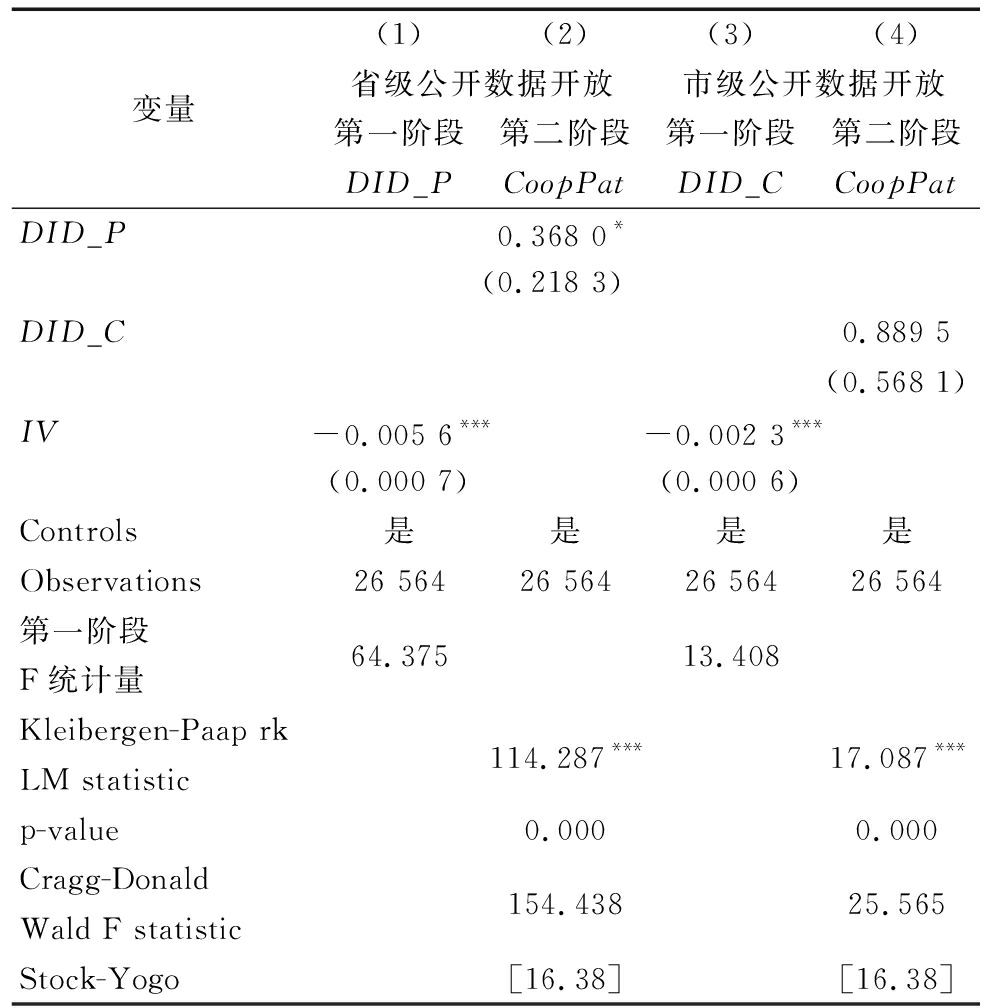 变量(1)(2)(3)(4)省级公开数据开放市级公开数据开放第一阶段第二阶段第一阶段第二阶段DID_PCoopPatDID_CCoopPatDID_P0.368 0*(0.218 3)DID_C0.889 5(0.568 1)IV-0.005 6***-0.002 3***(0.000 7)(0.000 6)Controls是是是是Observations26 56426 56426 56426 564第一阶段F统计量64.375 13.408 Kleibergen-Paap rkLM statistic114.287***17.087***p-value0.0000.000Cragg-DonaldWald F statistic154.43825.565Stock-Yogo[16.38][16.38]