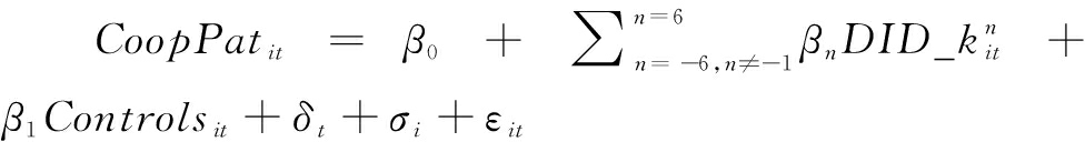其中,i代表企业,t代表年份;CoopPatit代表企业i第t年的联合创新水平;DID_kit为政策虚拟变量,系数α1代表两级公共数据开放对企业联合创新的政策效果;Controlsit为本文控制变量;δt、σi分别为时间固定效应和个体固定效应;εit为随机误差项。