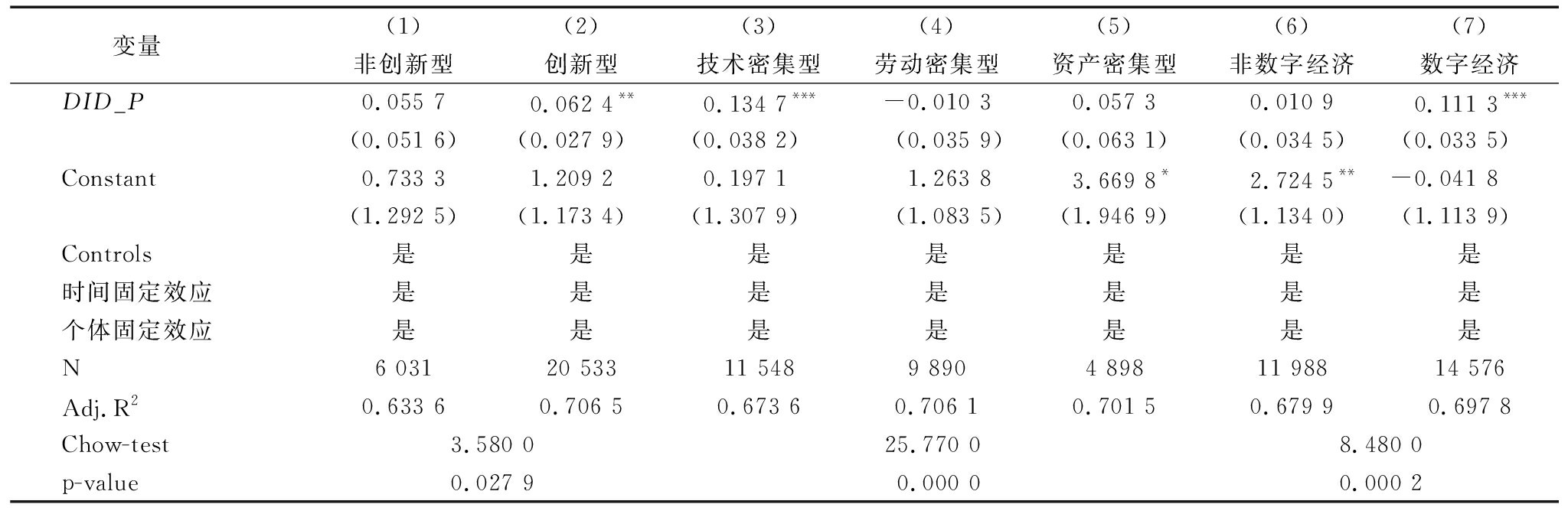 变量 (1)(2)(3)(4)(5)(6)(7)非创新型创新型技术密集型劳动密集型资产密集型非数字经济数字经济DID_P0.055 70.062 4**0.134 7***-0.010 30.057 30.010 90.111 3***(0.051 6)(0.027 9)(0.038 2)(0.035 9)(0.063 1)(0.034 5)(0.033 5)Constant0.733 31.209 20.197 11.263 83.669 8*2.724 5**-0.041 8(1.292 5)(1.173 4)(1.307 9)(1.083 5)(1.946 9)(1.134 0)(1.113 9)Controls是是是是是是是时间固定效应是是是是是是是个体固定效应是是是是是是是N6 03120 53311 5489 8904 89811 98814 576Adj.R20.633 60.706 50.673 60.706 10.701 50.679 90.697 8Chow-test3.580 0 25.770 0 8.480 0p-value0.027 90.000 00.000 2