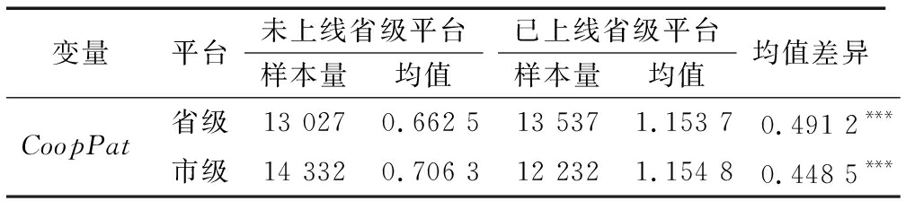 变量平台未上线省级平台样本量均值已上线省级平台样本量均值均值差异CoopPat省级13 0270.662 513 5371.153 70.491 2***市级14 3320.706 312 2321.154 80.448 5***