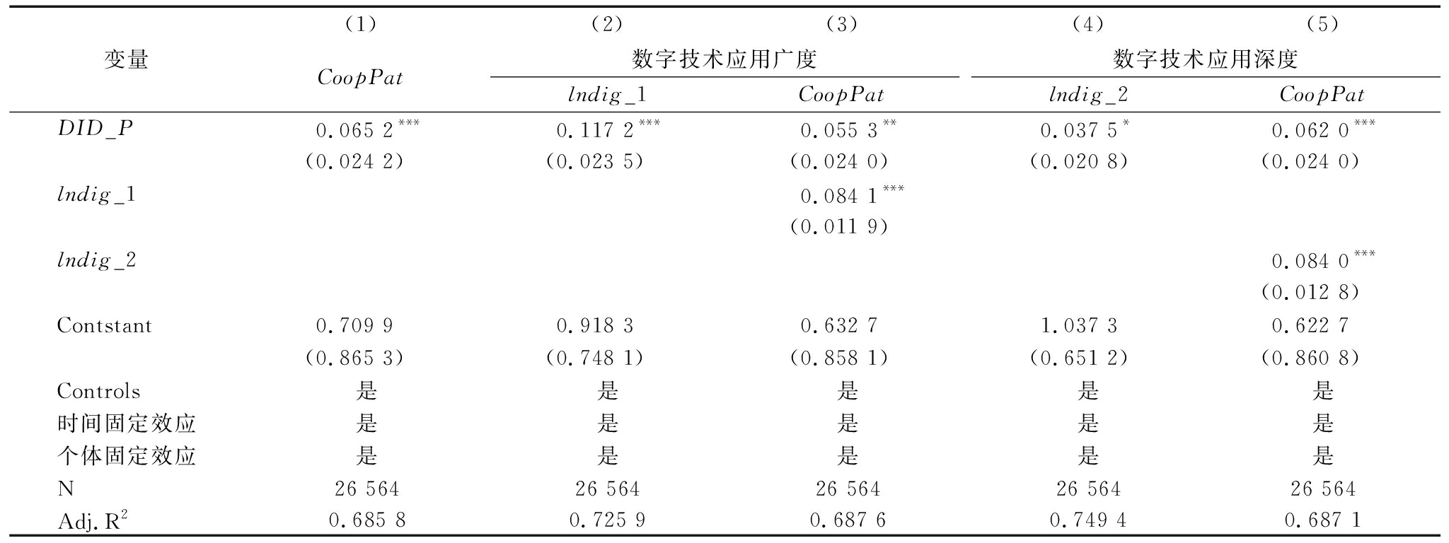 变量(1)CoopPat(2)(3)数字技术应用广度lndig_1CoopPat(4)(5)数字技术应用深度lndig_2CoopPatDID_P0.065 2***0.117 2***0.055 3**0.037 5*0.062 0***(0.024 2)(0.023 5)(0.024 0)(0.020 8)(0.024 0)lndig_10.084 1***(0.011 9)lndig_20.084 0***(0.012 8)Contstant0.709 90.918 30.632 71.037 30.622 7(0.865 3)(0.748 1)(0.858 1)(0.651 2)(0.860 8)Controls是是是是是时间固定效应是是是是是个体固定效应是是是是是N26 56426 56426 56426 56426 564Adj.R20.685 80.725 90.687 60.749 40.687 1